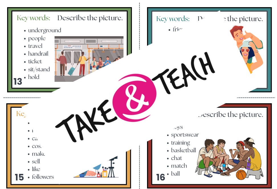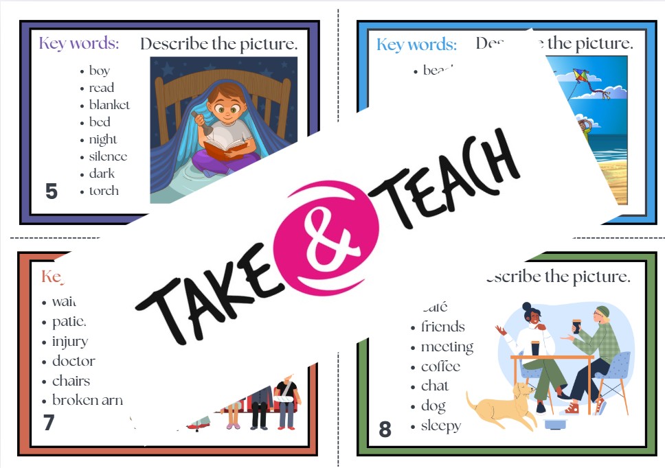 - Každá karta má klíčová slova k popisu obrázku, lidí, místa, situace.
