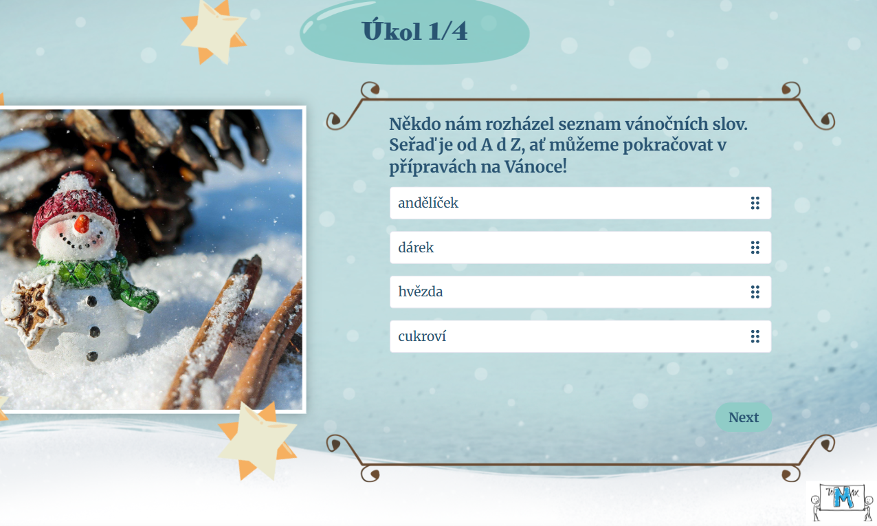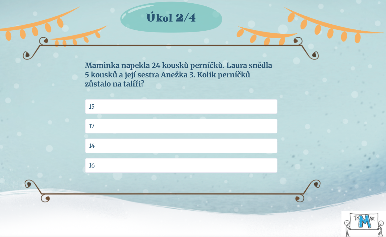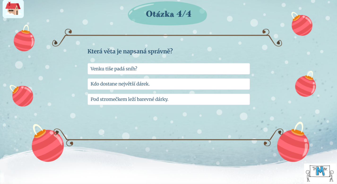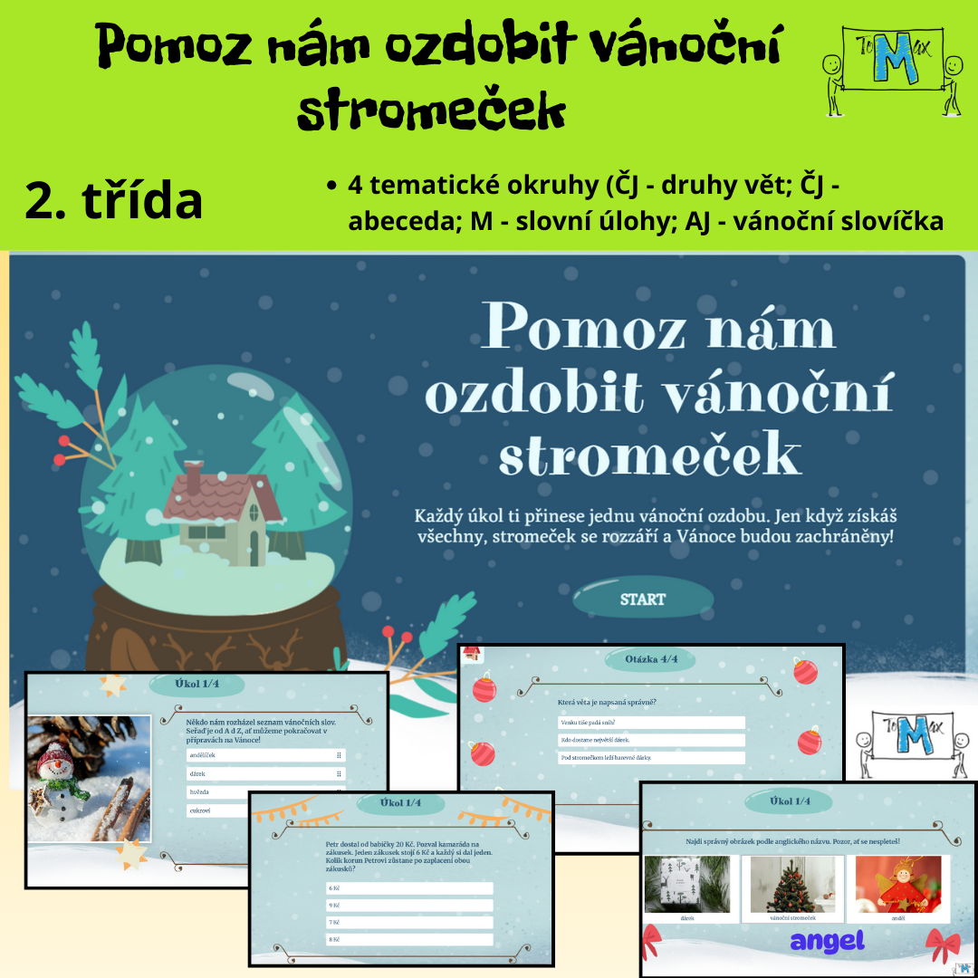 Tato interaktivní hra slouží k zopakování učiva 2. ročníku zábavnou formou. Hra obsahuje 4 tematické okruhy úkolů. Za každý správně vyřešený úkol se žáci posunou dál. Na konci je čeká odměna - odkaz na vánoční písničku na Youtube.