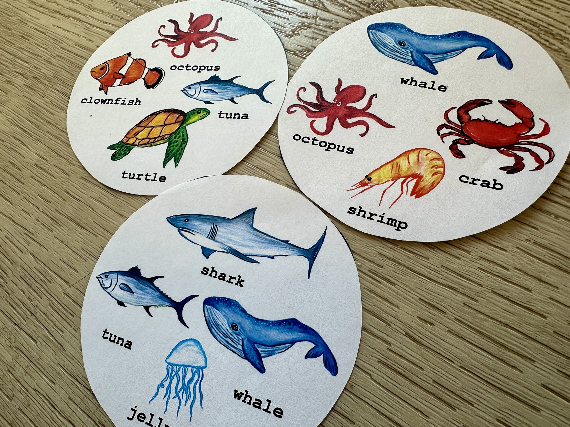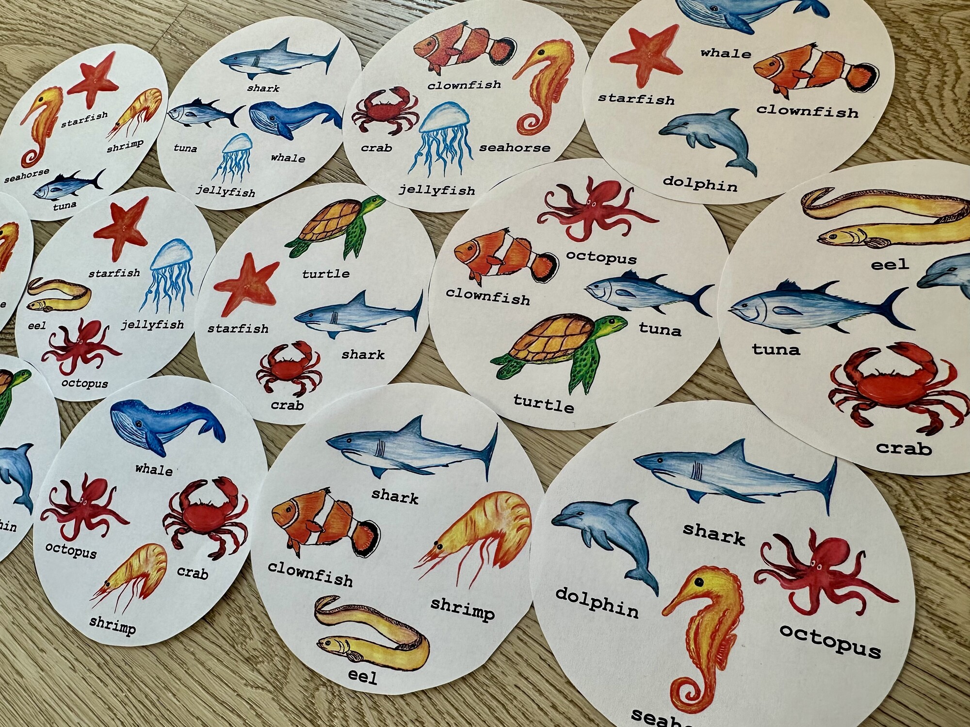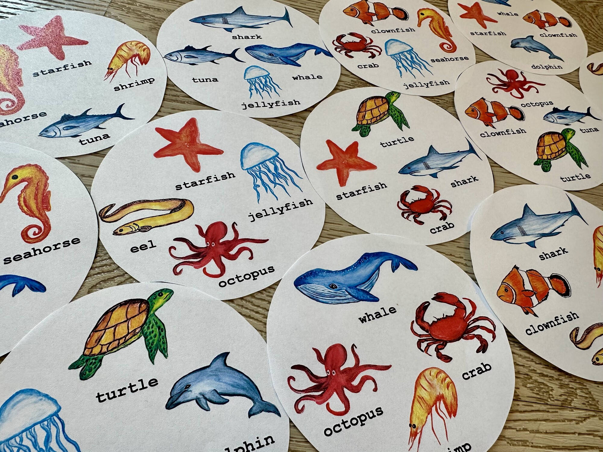 Materiál obsahuje 5 A4 stran karet ke hře s ručně malovanými obrázky na téma Sea Animals. Procvičení rychlého postřehu a slovíček.