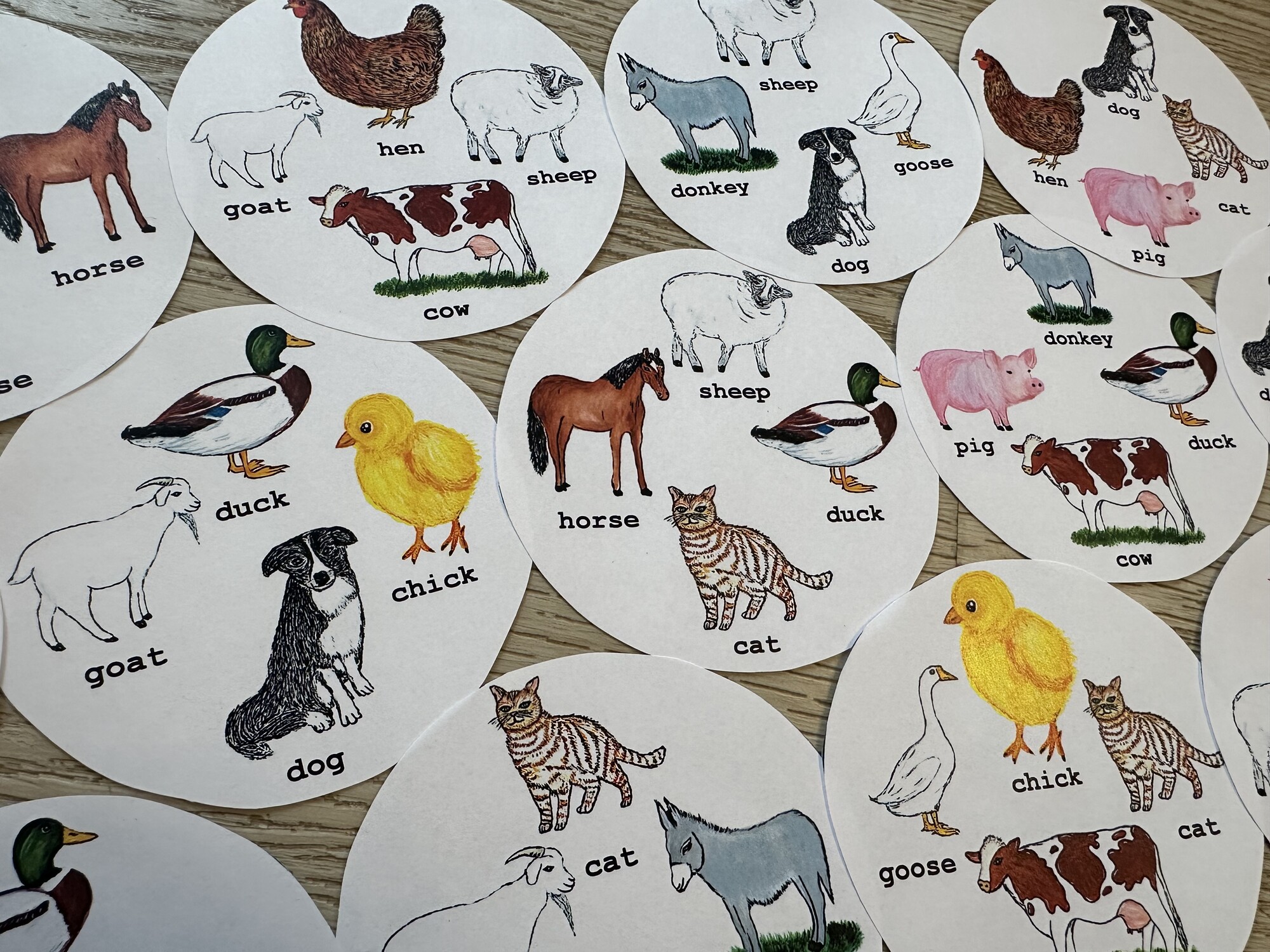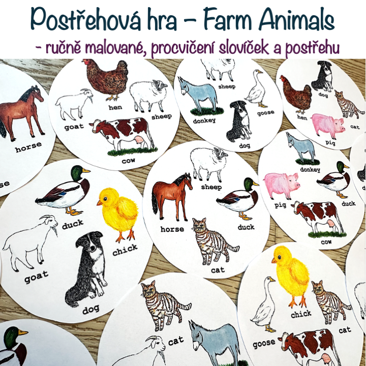 Materiál obsahuje 4 A4 stran hry – 13 karet. Ručně malované obrázky k tématu Farm Animals. Procvičení slovíček a postřehu. Na kartě jsou 4 obrázky se slovy a hledá se vždy společný obrázek na kartách.