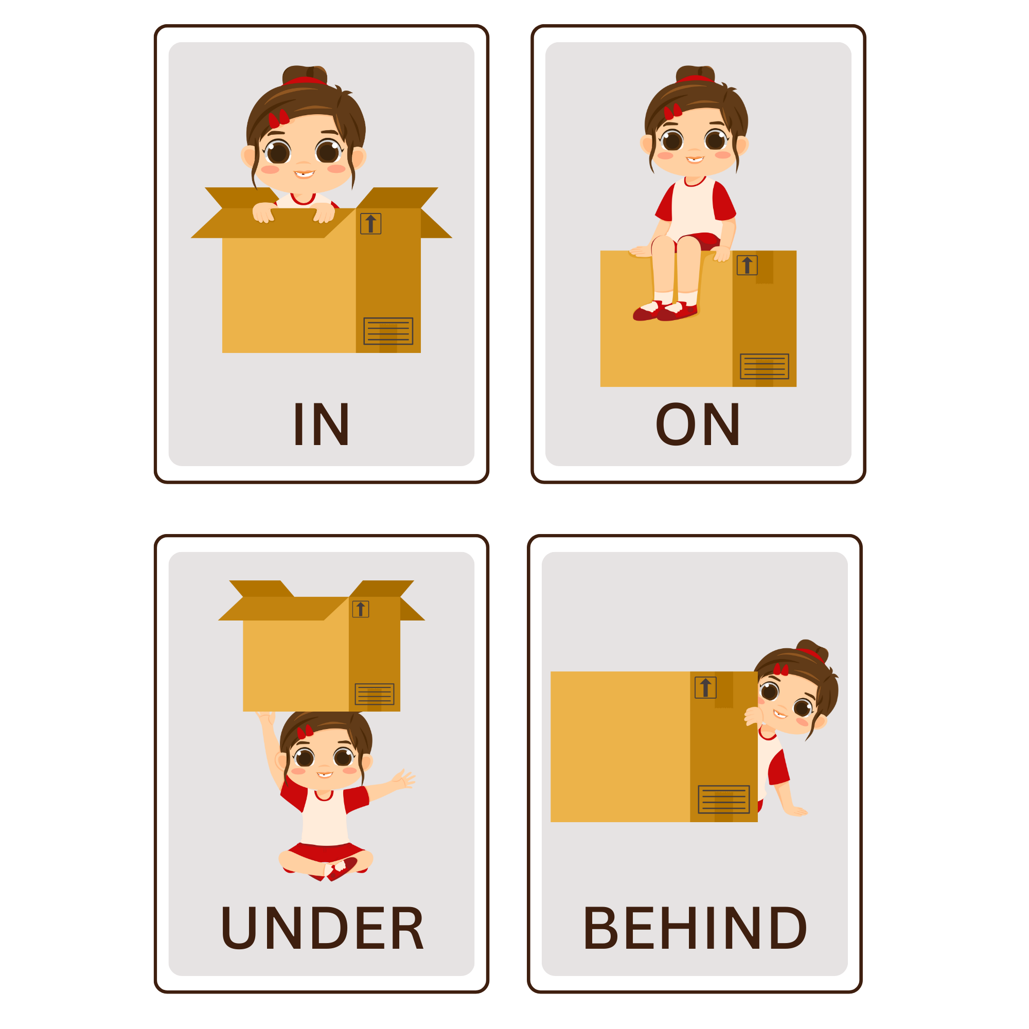 - Vizuální podpora: Každá karta znázorňuje polohu předmětu v jednoduchém kontextu (např. kočka pod krabicí), což pomáhá k rychlému zapamatování spojení slova a jeho významu.