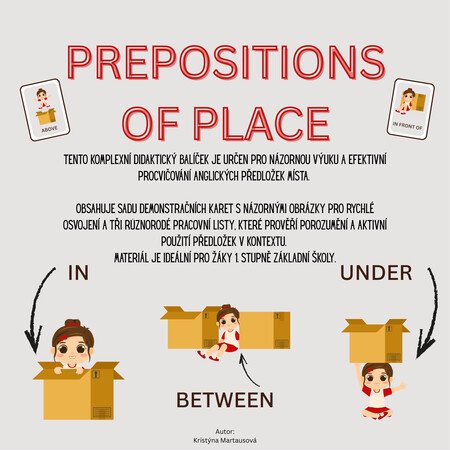 Ukončete nudné biflování gramatiky! Tento ucelený didaktický materiál Prepositions of place je vytvořen tak, aby si děti osvojily základní anglické předložky místa (in, on, under, next to, behind, in front of, between a další) s radostí a hlubokým pochopením. Balíček je ideální pro učitele i rodiče dětí na prvním stupni ZŠ.