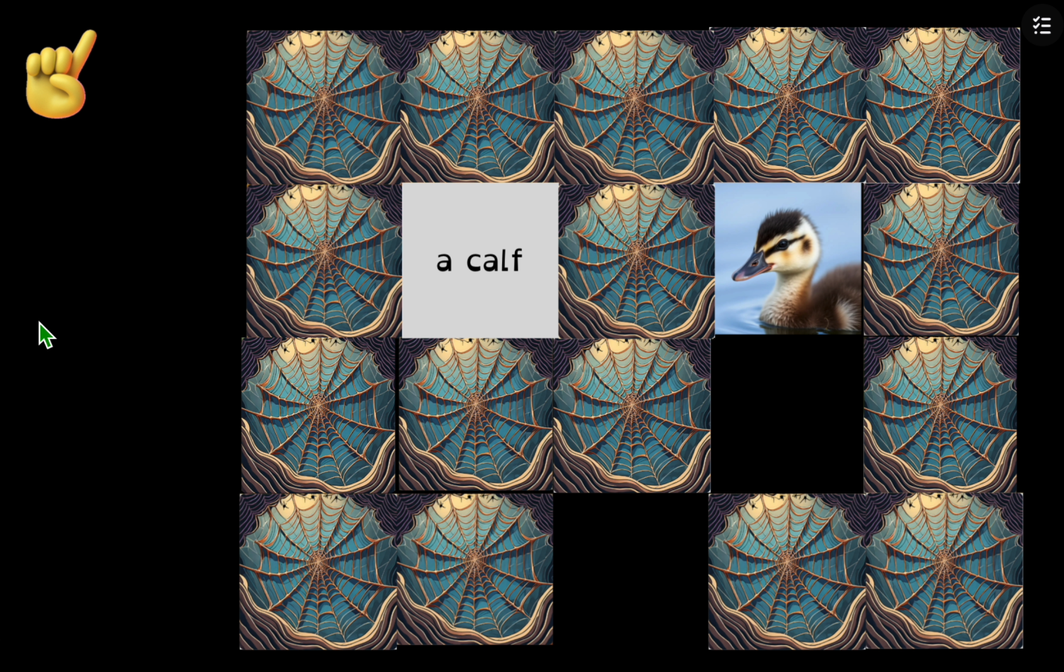 Místnost 1 Animals (vocabulary) = 2 pexesa - v pexesu žák spojuje obrázky zvířat se slovíčky, celkem 10 domácích zvířat (mláďat) a 10 divokých zvířat