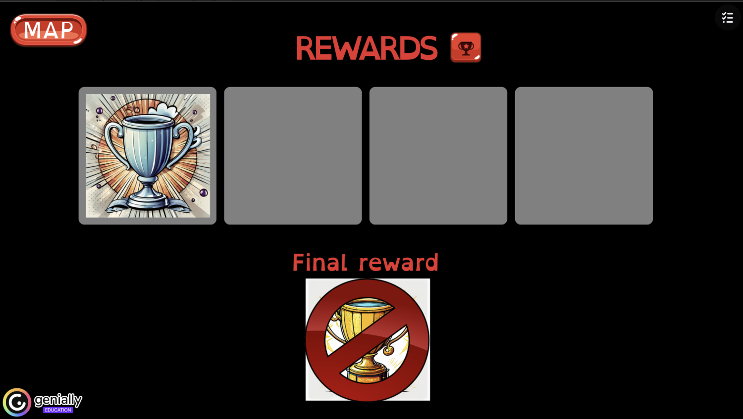 Splněním všech 4 hlavních částí se v odměnách odemkne hlavní odměna (zlatý pohár), kliknutím na něj se žák dostane na závěrečnou obrazovku.