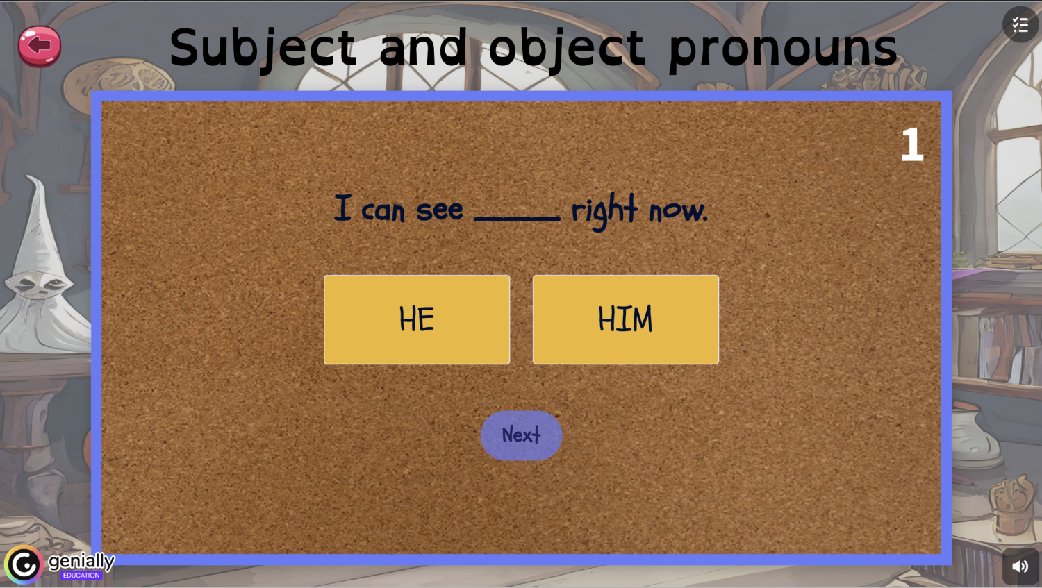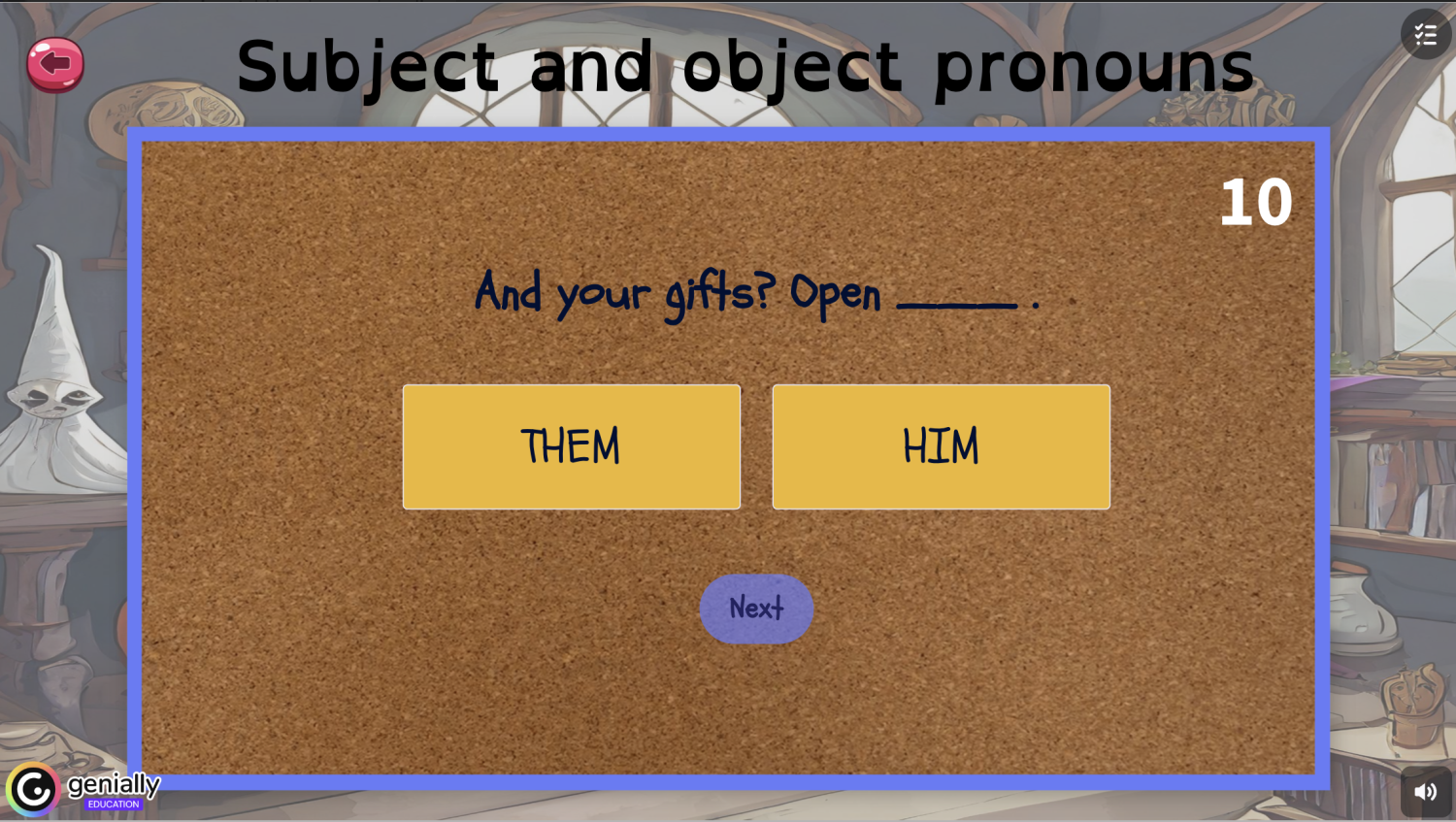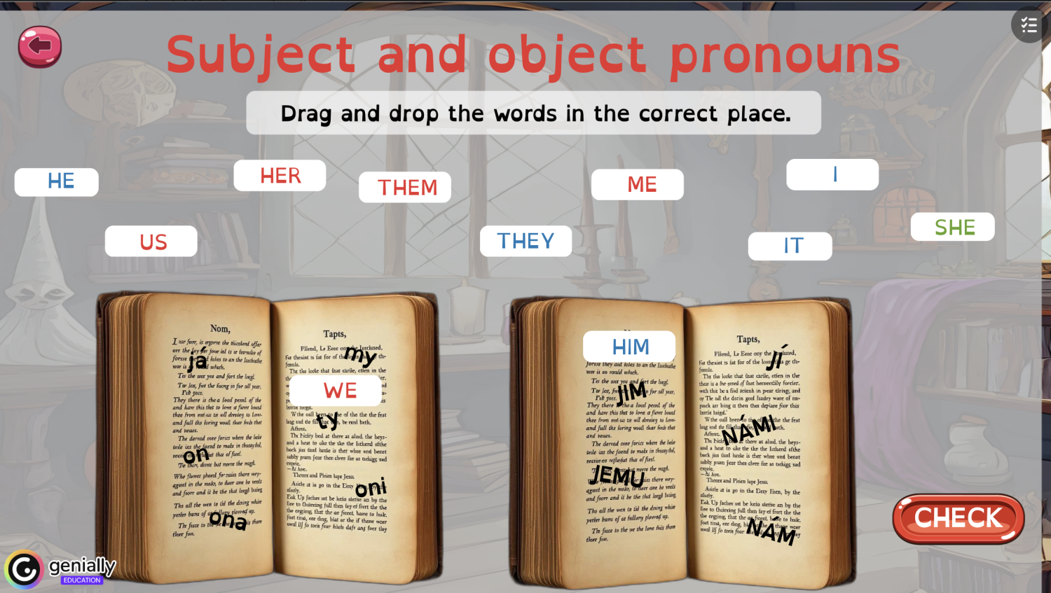 Místnost 2 - Subject and object pronouns = v první části žák rozdělí zájmena do správných kategorií; ve druhé části v 10 větách vybírá vhodné zájmeno