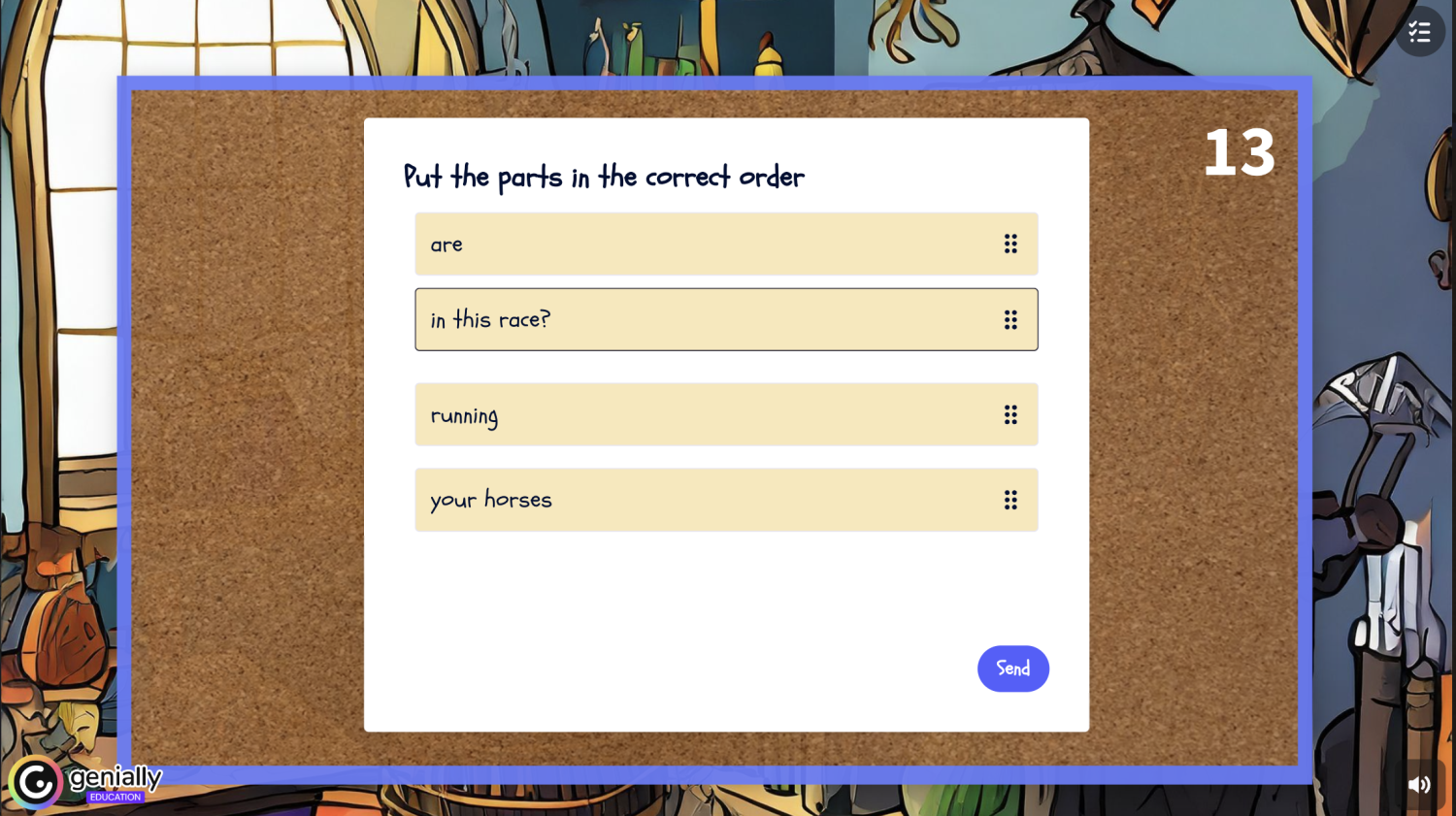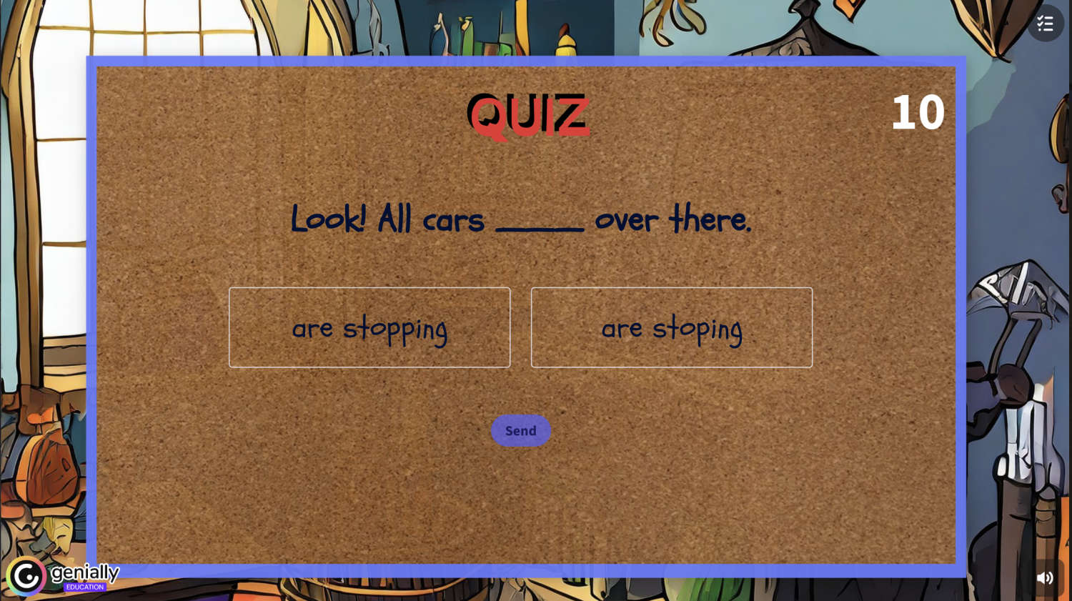 Místnost 4 - Quiz = 10 otázek typu “multiple choice”, ve kterých žák musí správně poznat, jestli doplní present simple nebo continuous. V dalších 5 větách musí ukázat znalost správného slovosledu ve větě (pouze present continuous)
