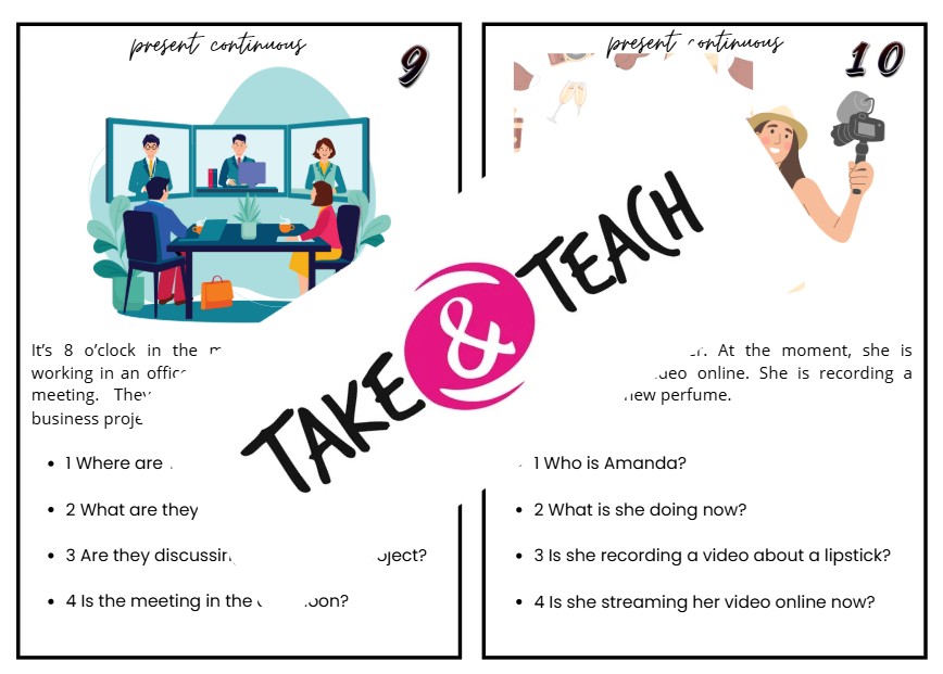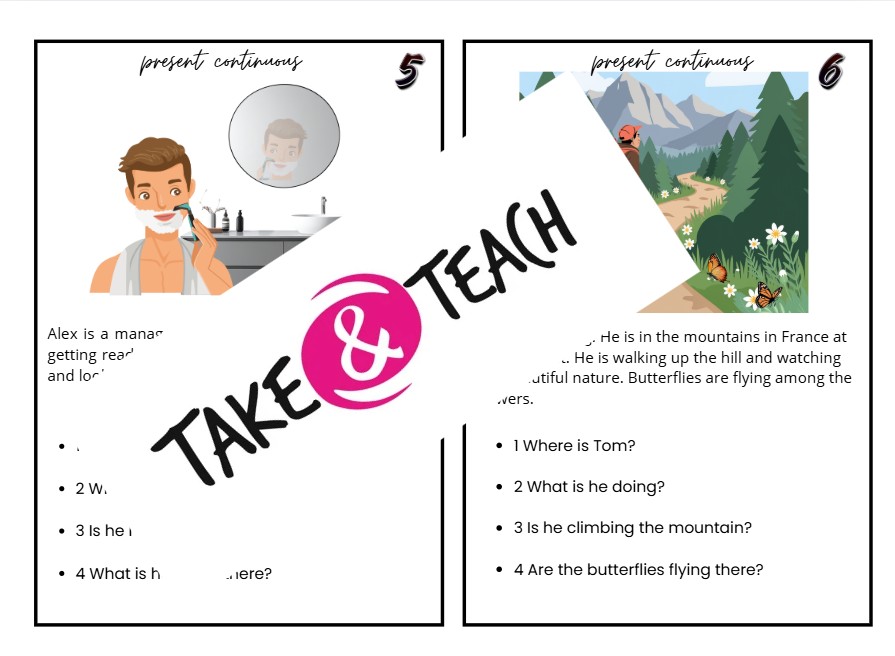 Procvičte s žáky přítomný čas průběhový na situačních kartičkách s krátkým příběhem s doplňujícími otázkami a odpověďmi z druhé strany pro rychlou sebekontrolu. Vhodné jako běhací diktát, konverzaci, čtení s porozuměním, nebo PRO RYCHLÍKY.