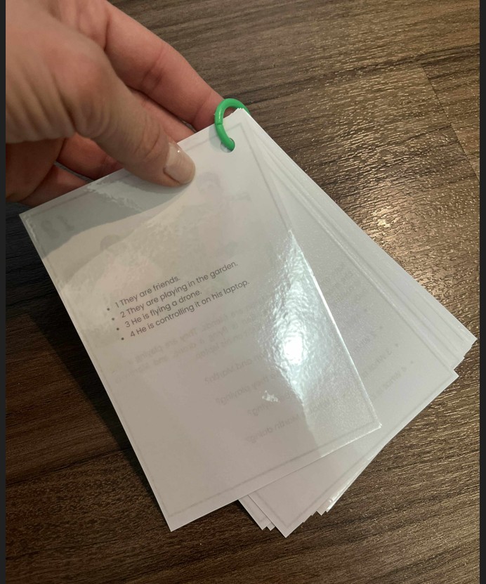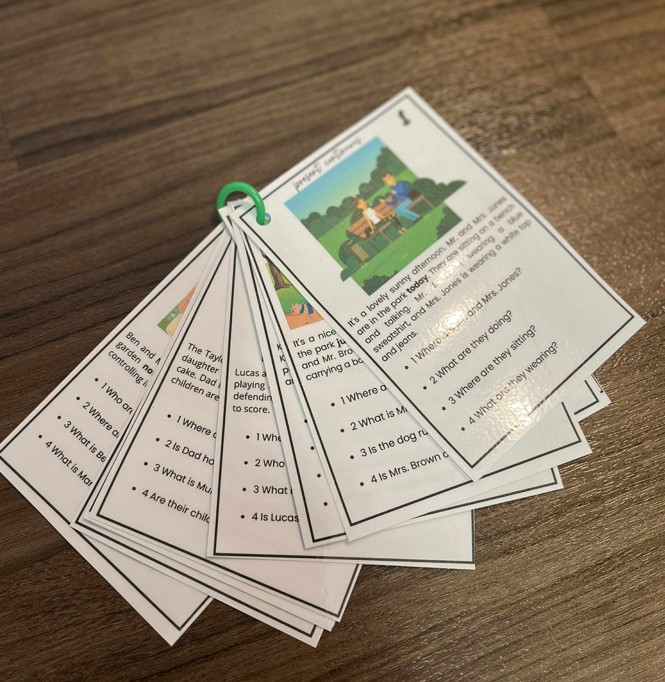 - 12 barevných obrázkových karet s krátkým příběhem a doplňujícími otázkami. Není nutné tisknout barevně, lze i ČB. Barvy nehrají v otázkách roli.