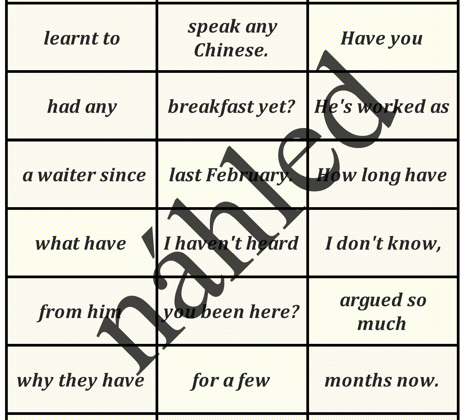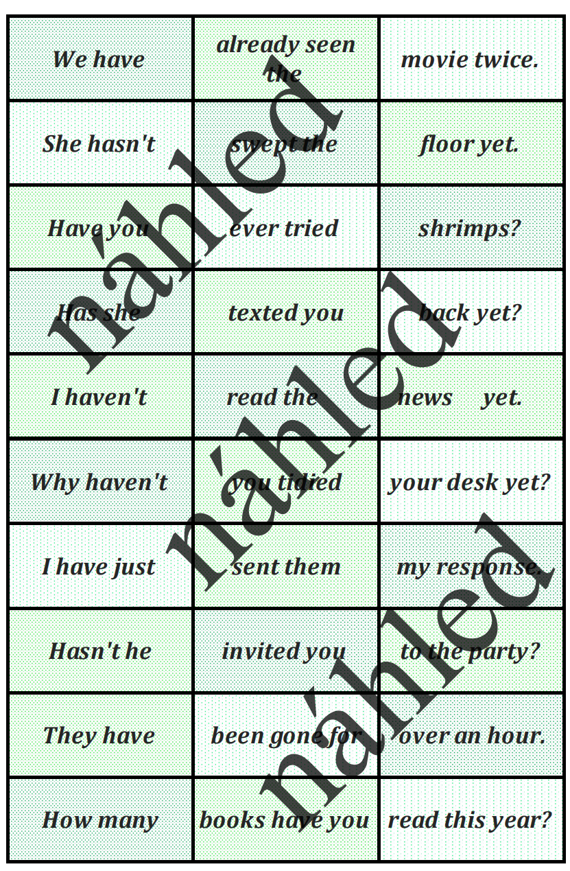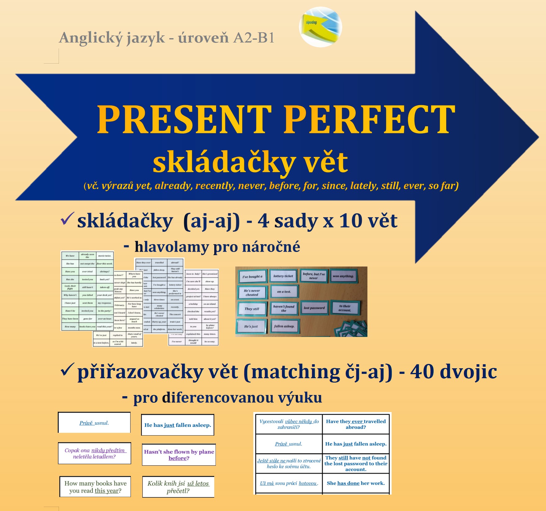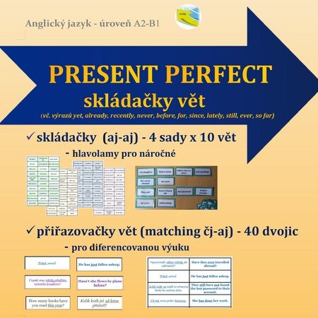 Materiál slouží k procvičení předpřítomného času, a to zejména z hlediska rozlišných situacích, ve kterých se tento anglický čas používá. Předpřítomný čas ve všech svých situačních podobách. Čtyři sady kartiček, každá sada skrývá 10 různě dlouhých vět s jediným správným řešením.