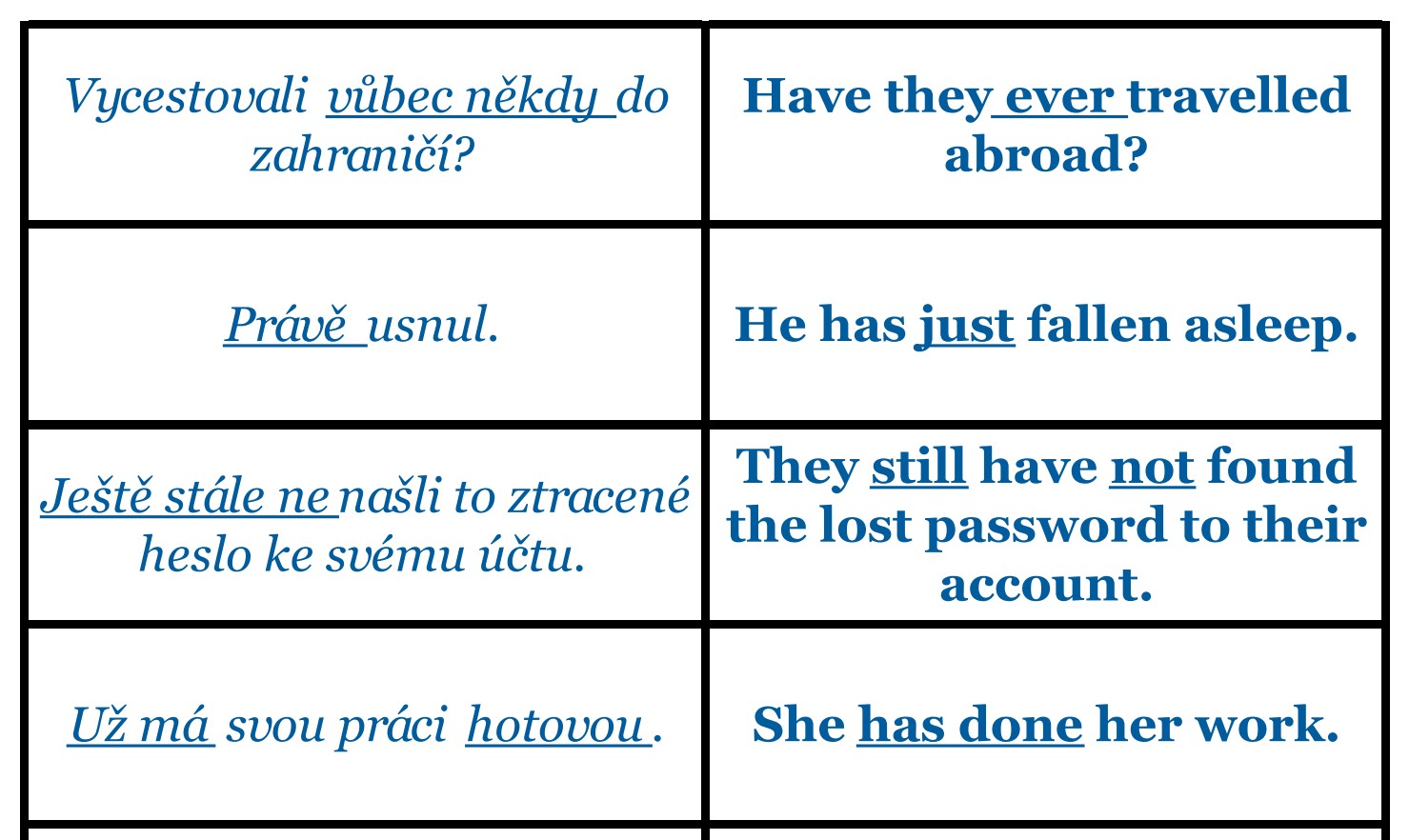 - Tabulky se správným řešením vět společně s jejich překlady do češtiny mohou sloužit jako pracovní list nebo k testování a procvičení překladu vět z/do angličtiny. Zároveň poslouží pro samostatnou kontrolu správnosti.