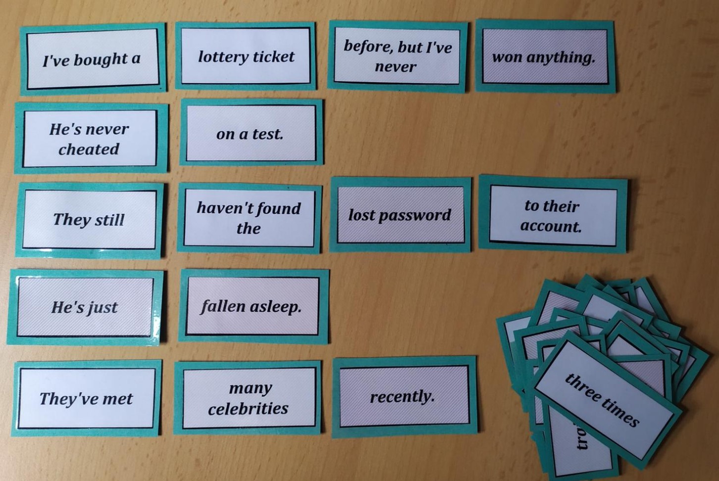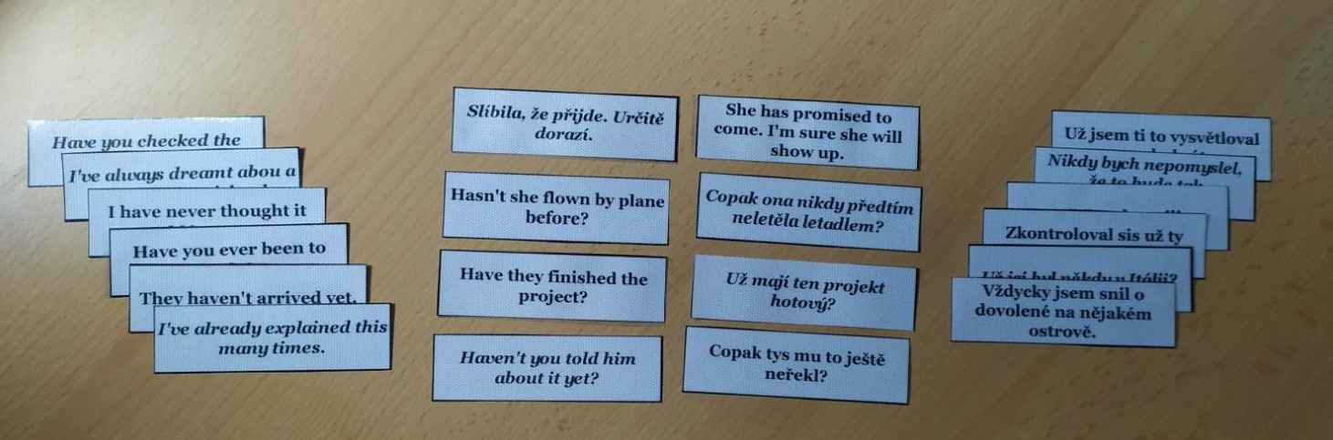 - SKLÁDAČKA VĚT. Žáci skládají jednotlivé části vět tak, aby každá hotová věta odpovídala gramatickým pravidlům a současně dávala smysl. Pro každou ze čtyř sad existuje správné řešení za využití všech kartiček - pakliže žáci dodrží gramatická pravidla, zvolí správný slovosled, předložkové vazby a správné kolokace.