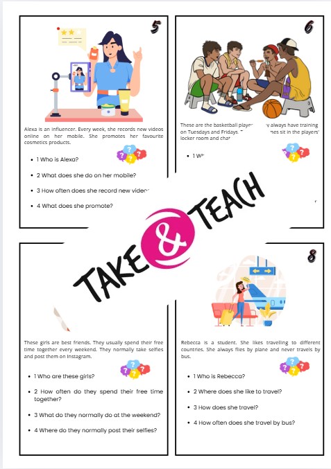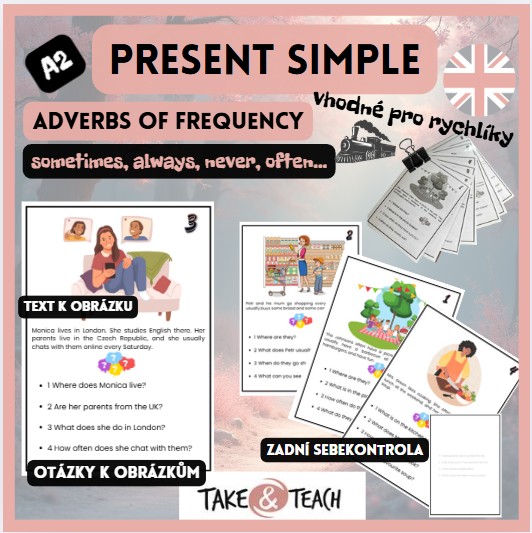 Máte ve třídě rychlíky, nebopotřebujete procvičit present simple a příslovce častosti (always, sometimes, usually....? Využijte obrázkové karty s krátkým popisem v textu a k nim následné otázky. Karty mají sebekontrolu, lze jako běhací hra.