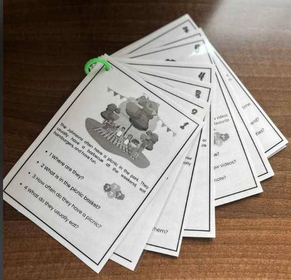 - 12 barevných obrázkových karet / lze ale tisknout i ČB - barva nehraje v otázkách roli - obrázek, krátký text k obrázku, 4 otázky s užitím příslovcí častosti.