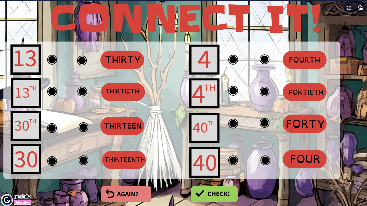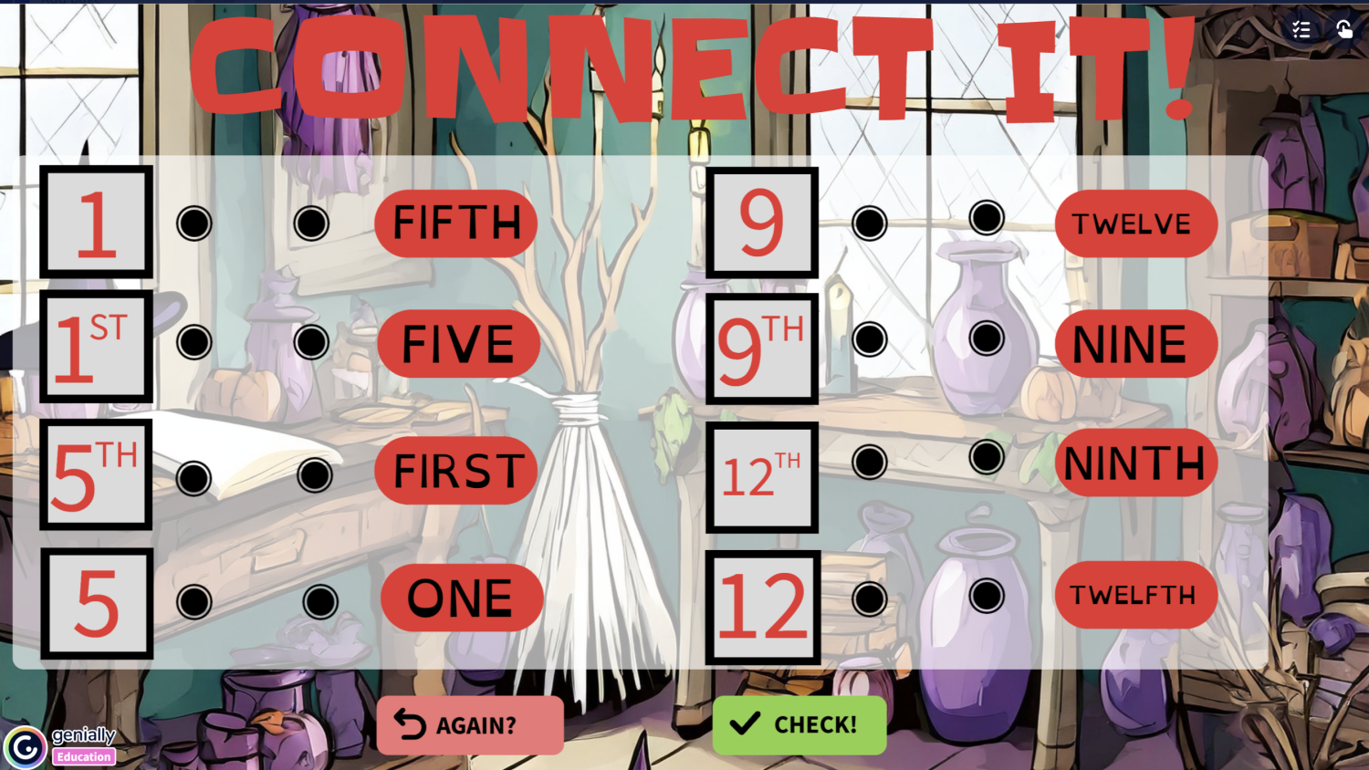 Místnost 3 - Ordinal numbers = žáci spojují tečkami číslovky - psané slovo s číslem a musí správně rozlišovat mezi základními a řadovými číslovkami. Vybral jsem záměrně často se pletoucí čísla, celkem 16.