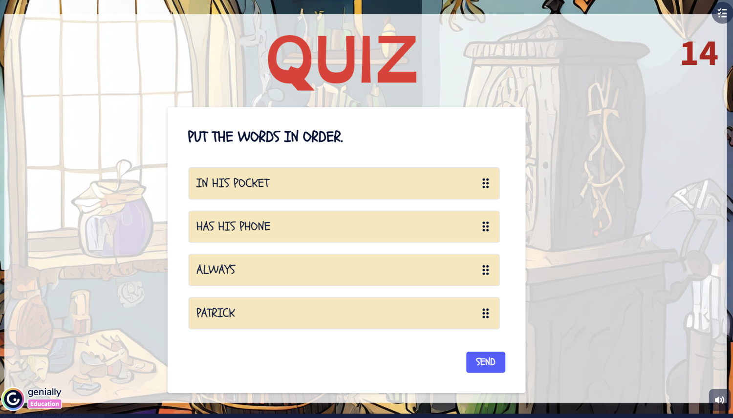 Místnost 4 - Quiz = 20 otázek na present simple; 10 otázek typu “multiple choice”, 10 otázek - přesunují slova do správného slovosledu.