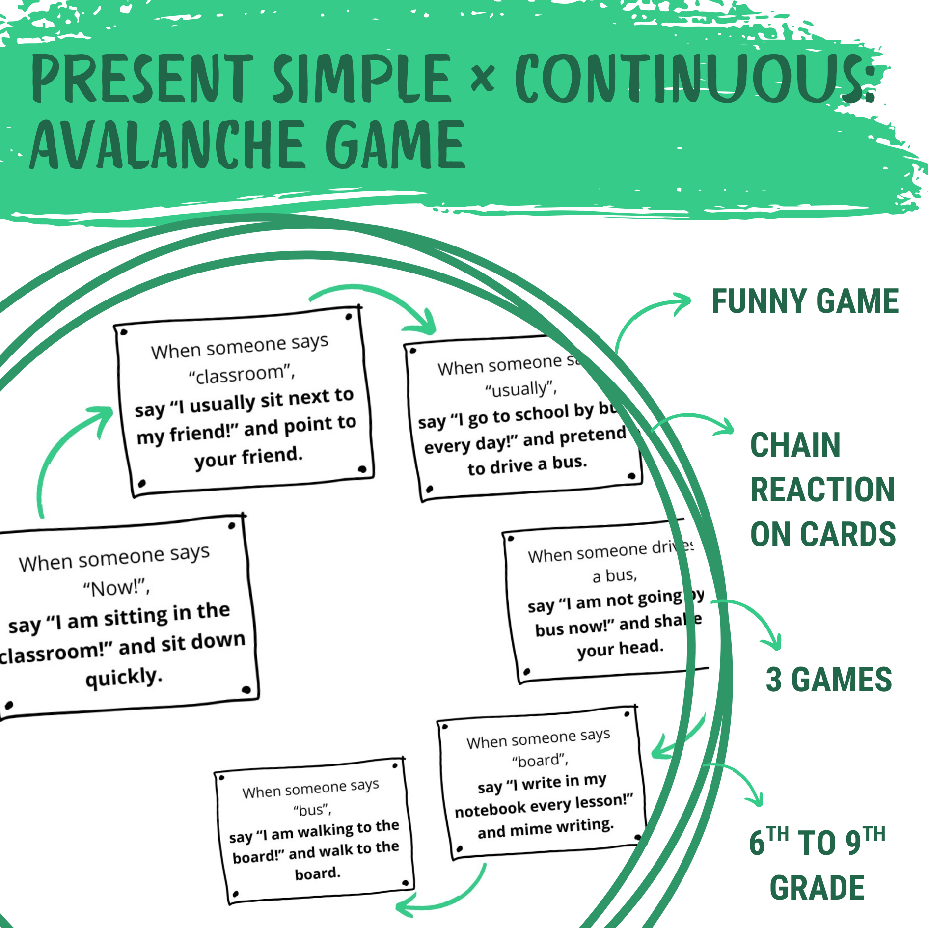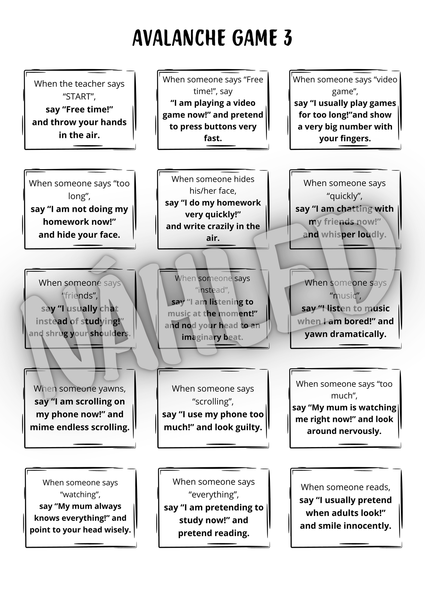 Zábavná pohybová hra, kde každá kartička s pokynem spustí další akci, jako lavina na horách! Žáci si procvičí použití přítomného času prostého a průběhového – v kontextu příběhu a v zábavné řetězové reakci.