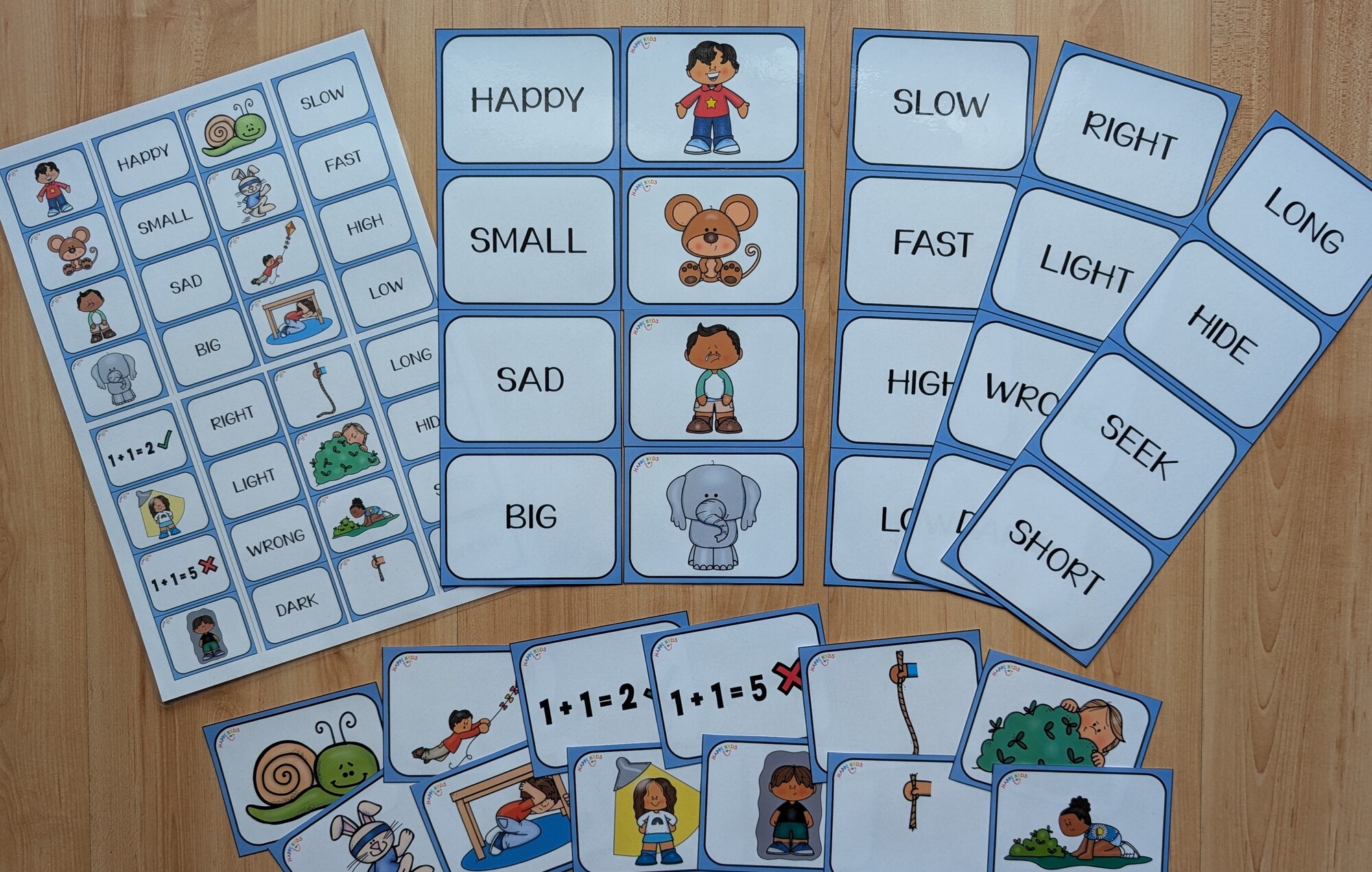 Vše rozdělte na jednotlivé kartičky, které budou mít děti za úkol seskládat do správných dvojic. Všechny kartičky pak můžete využít i jinak (pojmenovávání obrázků, čtení, spelling, popis …).