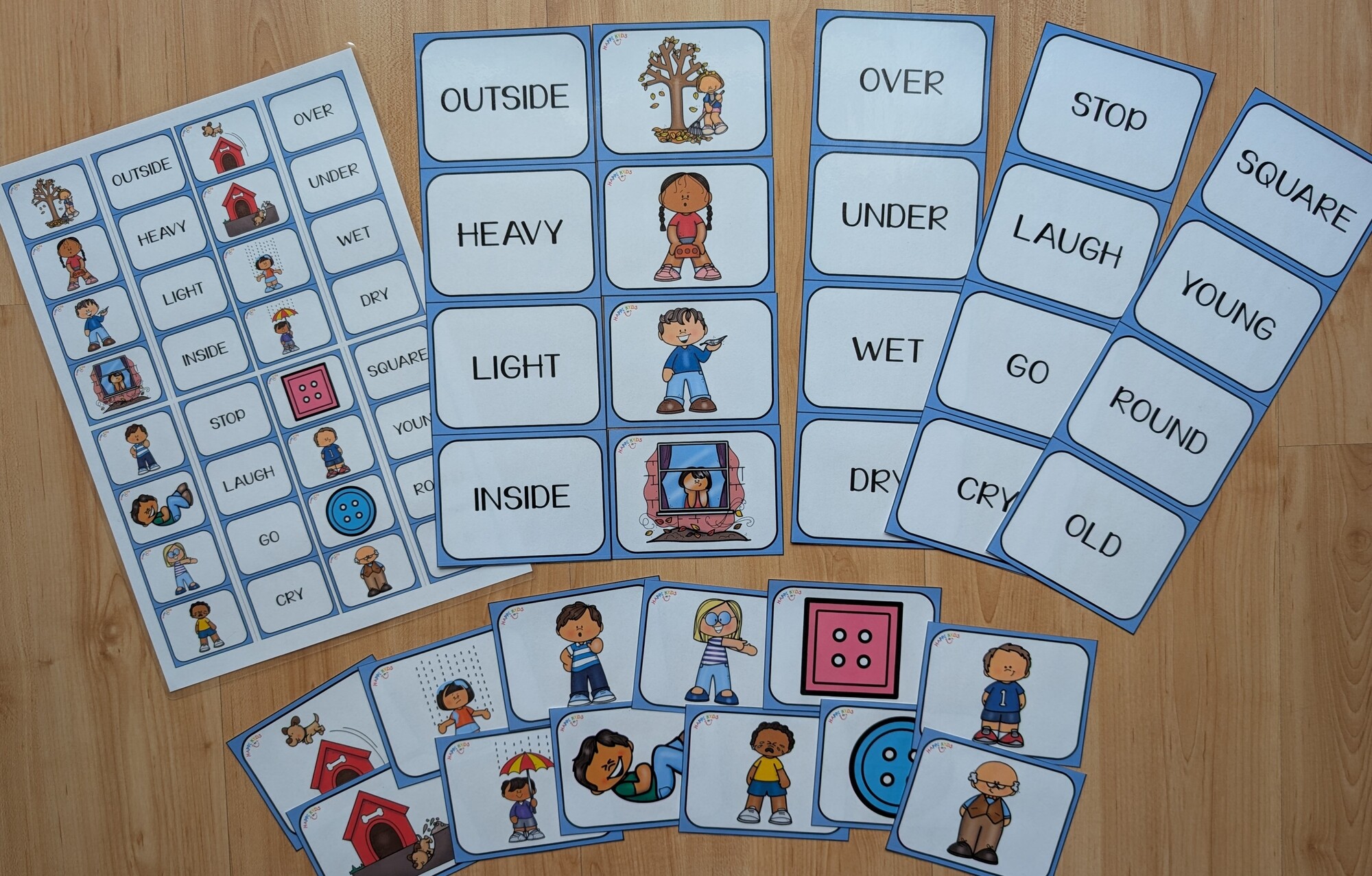 Vše rozdělte na jednotlivé kartičky, které budou mít děti za úkol seskládat do správných dvojic. Všechny kartičky pak můžete využít i jinak (pojmenovávání obrázků, čtení, spelling, popis …).