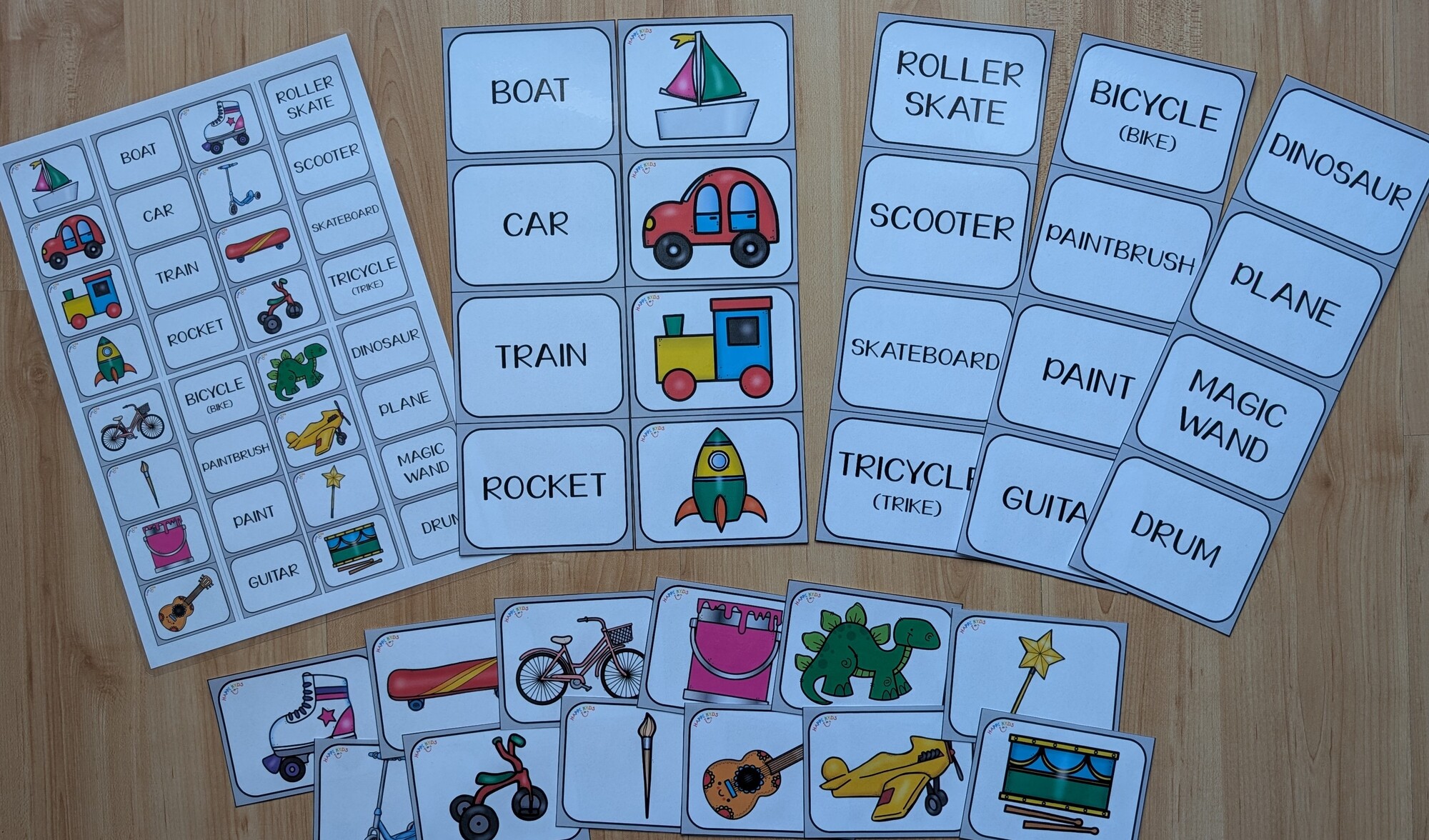 Vše rozdělte na jednotlivé kartičky, které budou mít děti za úkol seskládat do správných dvojic. Všechny kartičky pak můžete využít i jinak (pojmenovávání obrázků, čtení, spelling, popis …).