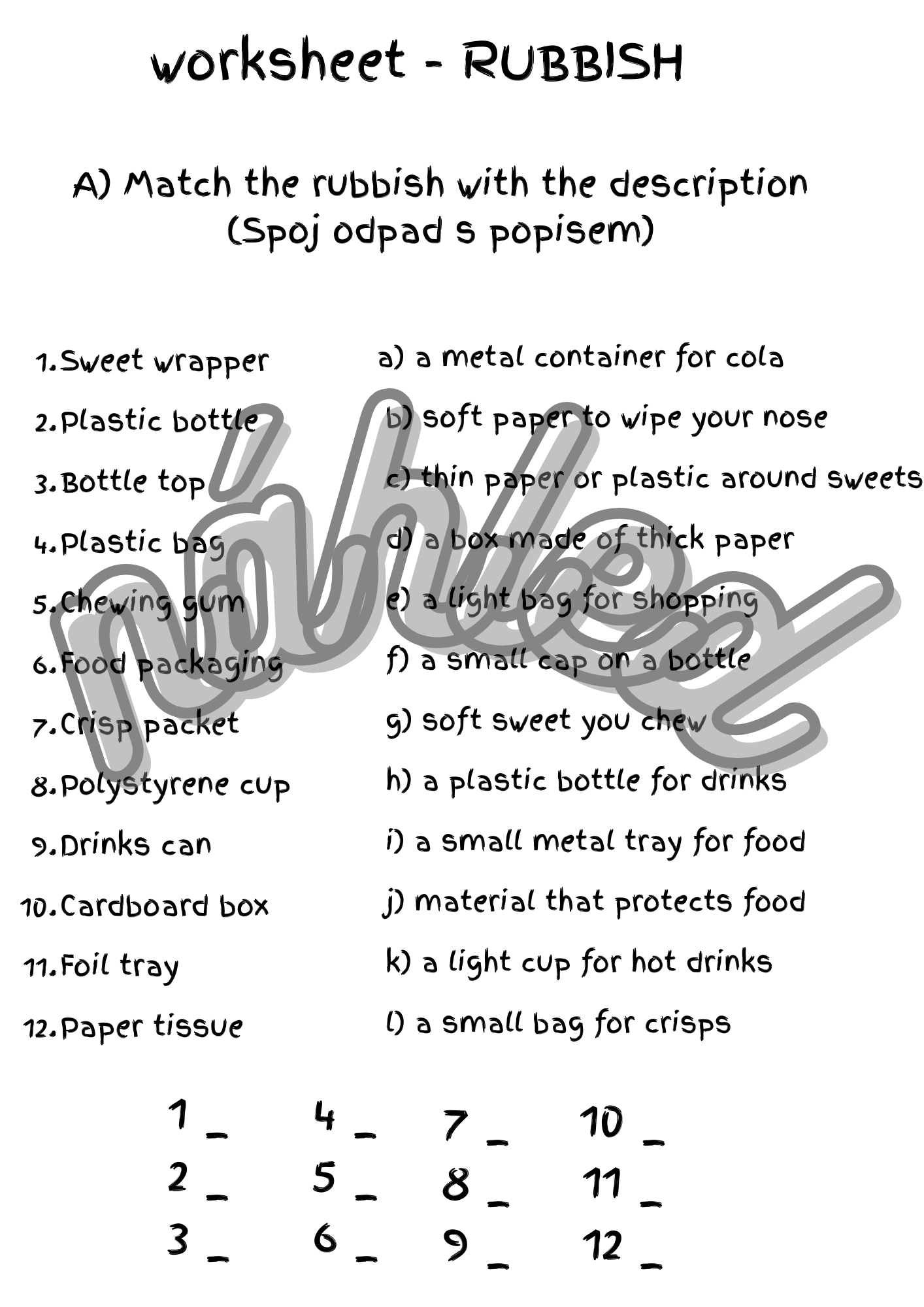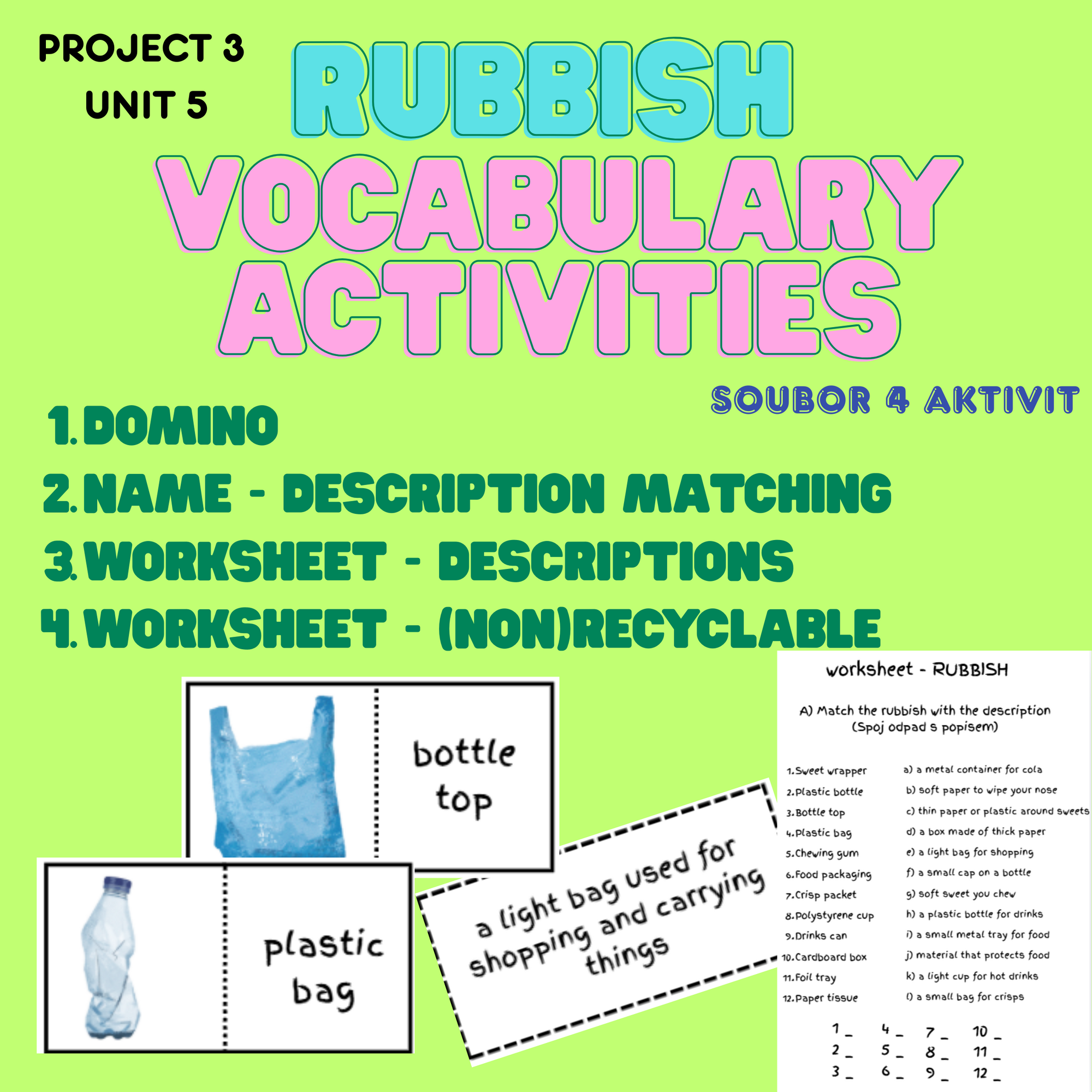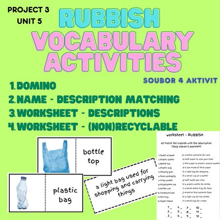 Materiál k procvičení slovní zásoby na téma odpady a recyklace. Vhodný k procvičení slovíček v lekci 5, Project 3. Vhodné také jako CLIL doplněk ke Dni Země.
