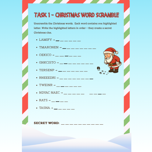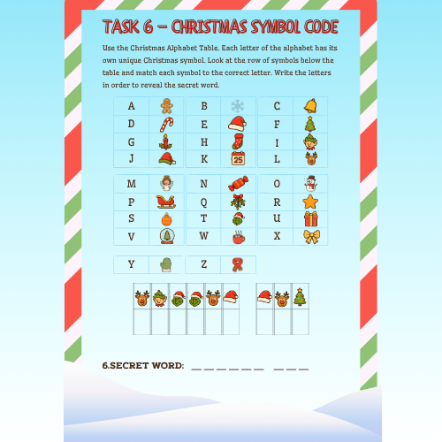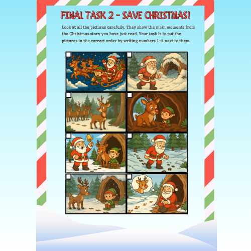 Tento materiál přináší kompletní vánoční únikovou hru v angličtině zaměřenou na slovní zásobu, čtení s porozuměním a logické myšlení. Žáci postupně řeší 10 na sebe navazujících úkolů a pomocí tajných slov odhalují, kam zmizel Rudolf a jak zachránit Vánoce.