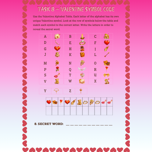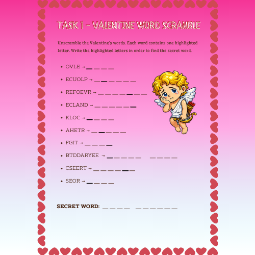 Žáci postupně řeší 10 na sebe navazujících úkolů, sbírají tajná slova a odhalují, kam zmizel Amor (Cupid) a jak zachránit Valentýn.