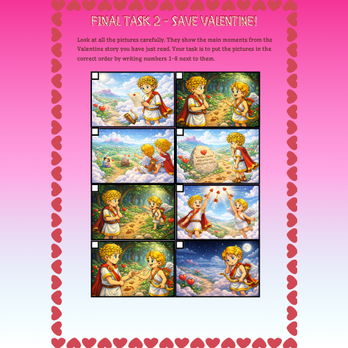 Tento materiál nabízí kompletní valentýnskou únikovou hru v angličtině, zaměřenou na slovní zásobu, čtení s porozuměním, logické myšlení a práci s příběhem.