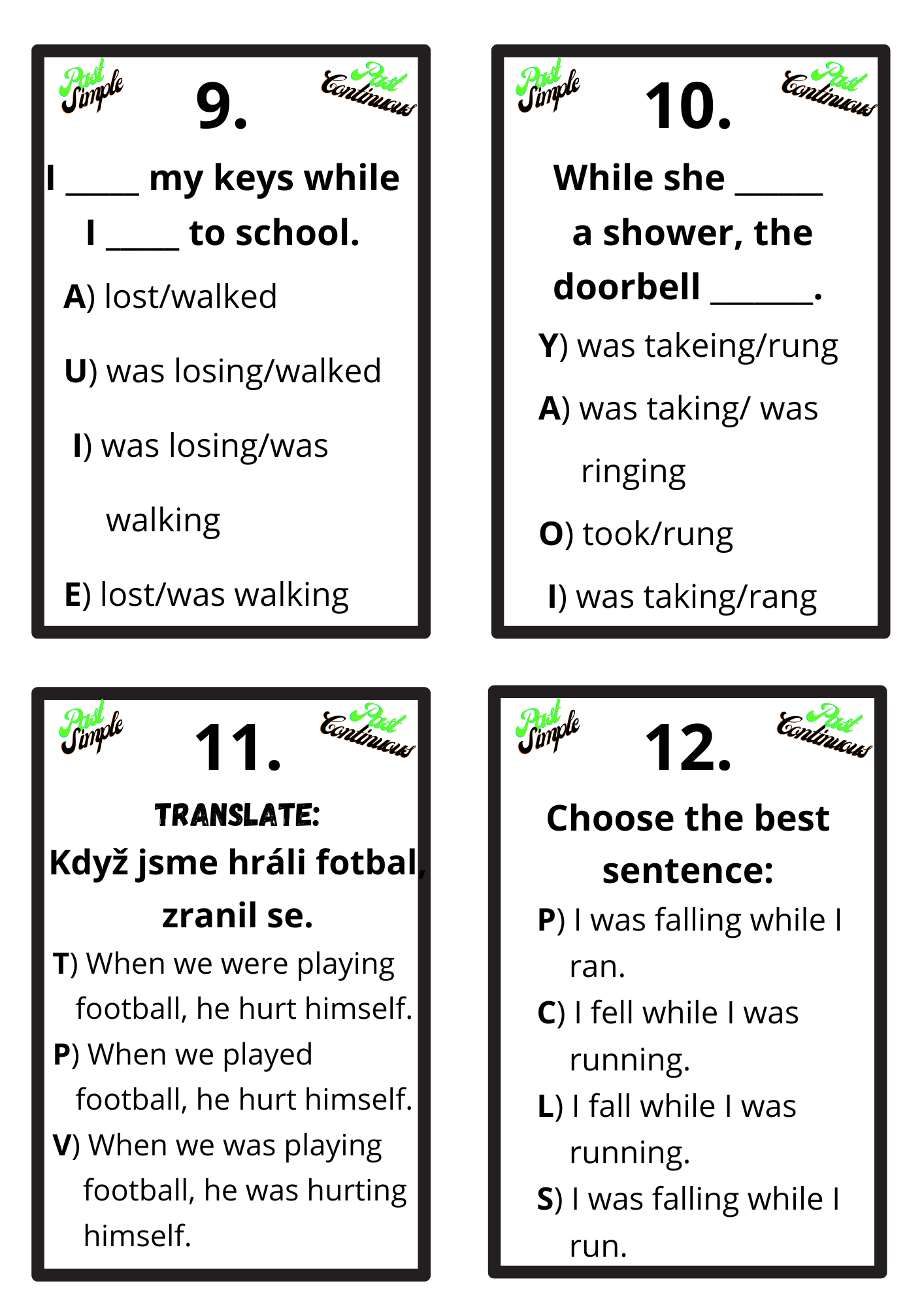 Materiál slouží k procvičení použití minulého času PROSTÉHO A PRŮBĚHOVÉHO (past simple/past continuous) v angličtině.