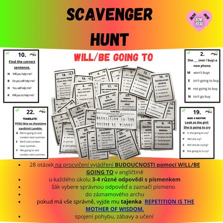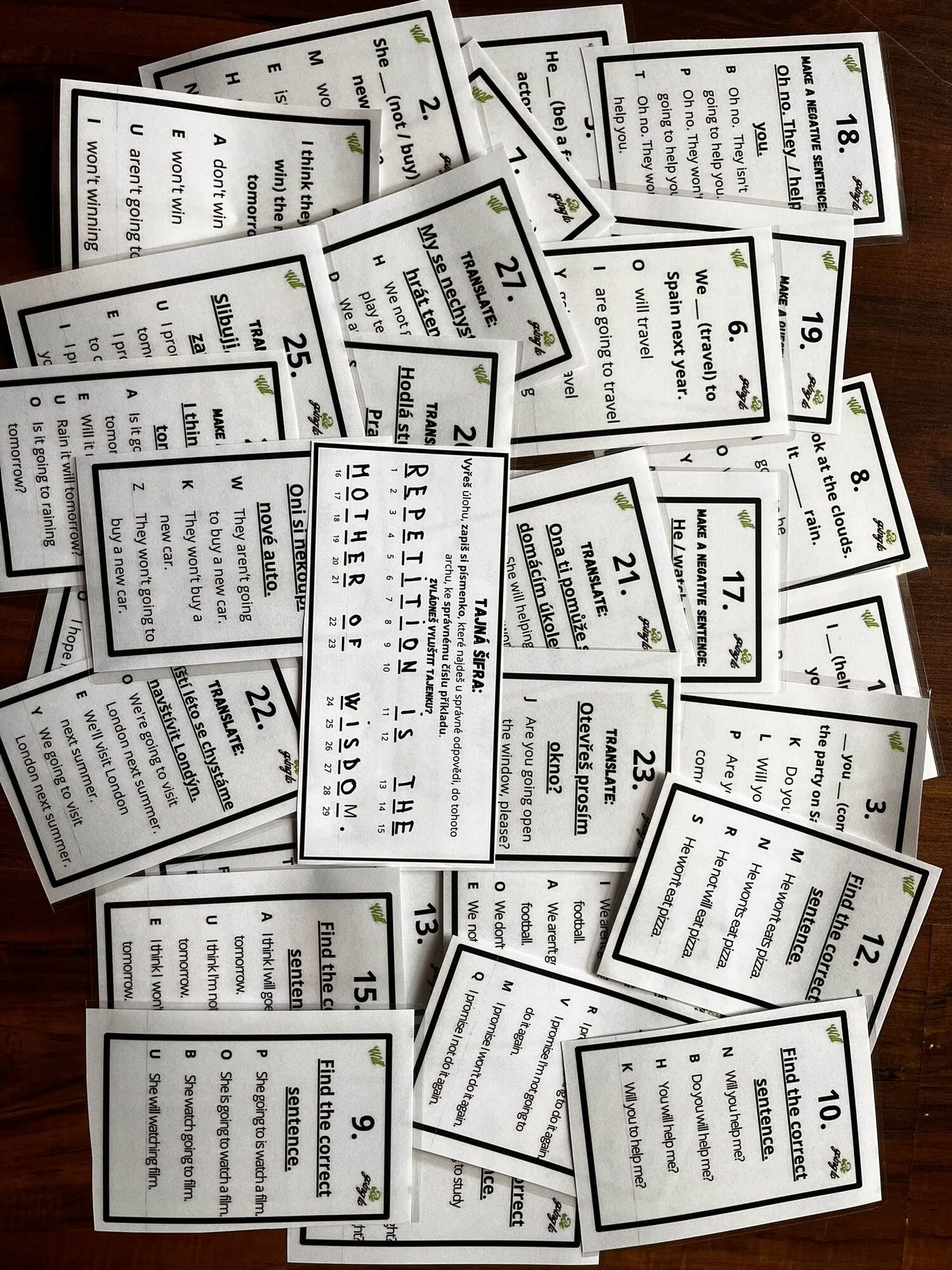 Materiál je potřeba vytisknout, otázky doporučuji zalaminovat, ale není to nutné. Poté je potřeba úkoly rozstříhat a rozložit na různá místa po třídě.