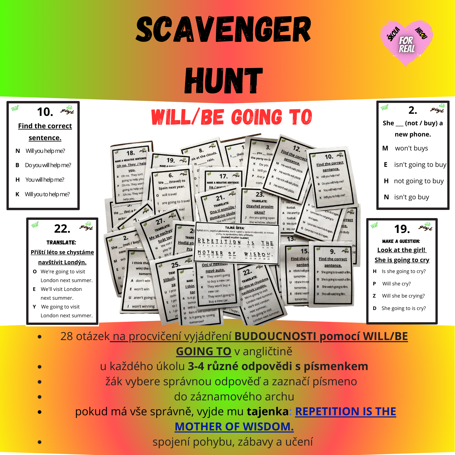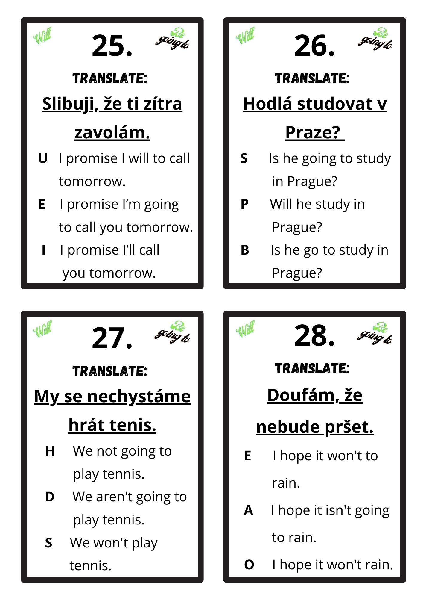 Materiál slouží k procvičení vyjádření budoucnosti pomocí WILL/BE GOING TO v angličtině.