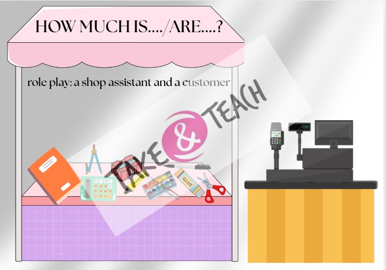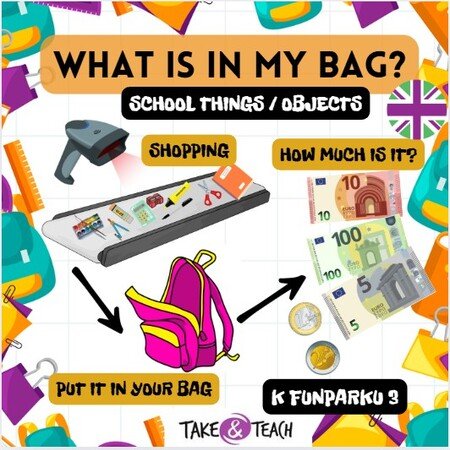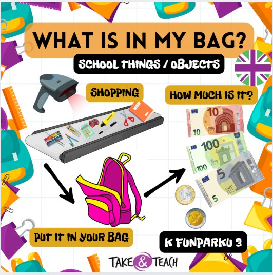 Nakupte s žáky pomůcky do školy pomocí virtuální měny a nákupního skeneru a natrénujte otázku How much ..? Procvičte s žáky paměť pomocí paměťové hry, co mají v batohu? What is in your bag?