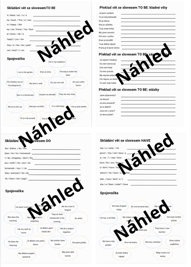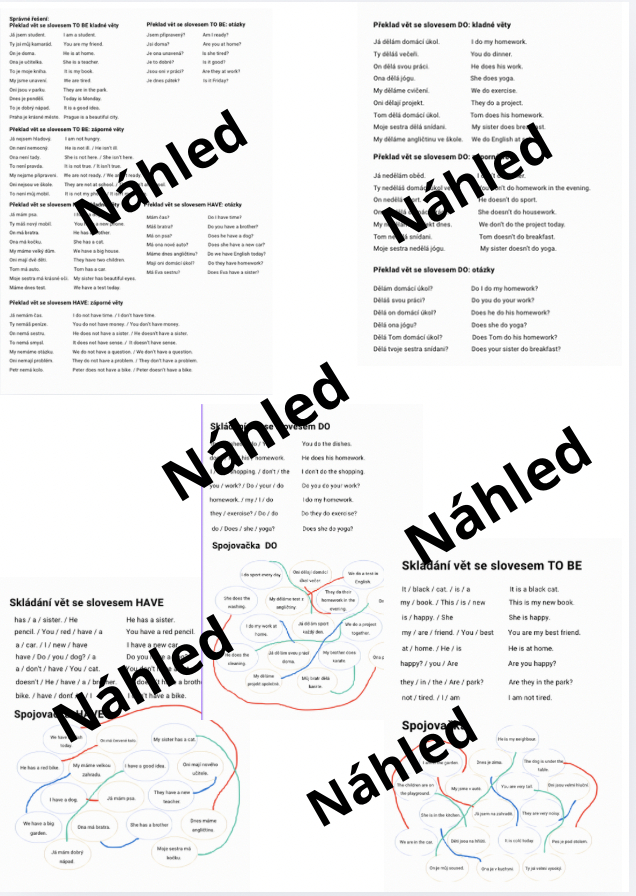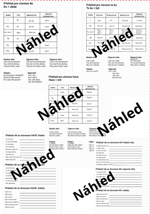 Obsah materiálu: Materiál obsahuje přehled pro slovesa to be, have a do. Procvičování překladů kladných, záporných vět a otázek. Spojování a skládání vět. Materiál také obsahuje řešení.