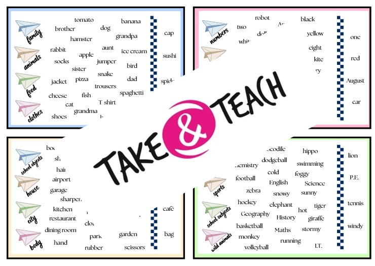 Sesbírejte slovíčka ze stejných tematických okruhů. 16 základních témat po 8 slovíčkách. Úroveň A1, témata pro 1. stupeň ZŠ. Vhodné jako opakování, procvičování, shrnutí slovní zásoby, nebo pro RYCHLÍKY. Se zadní sebekontrolou.