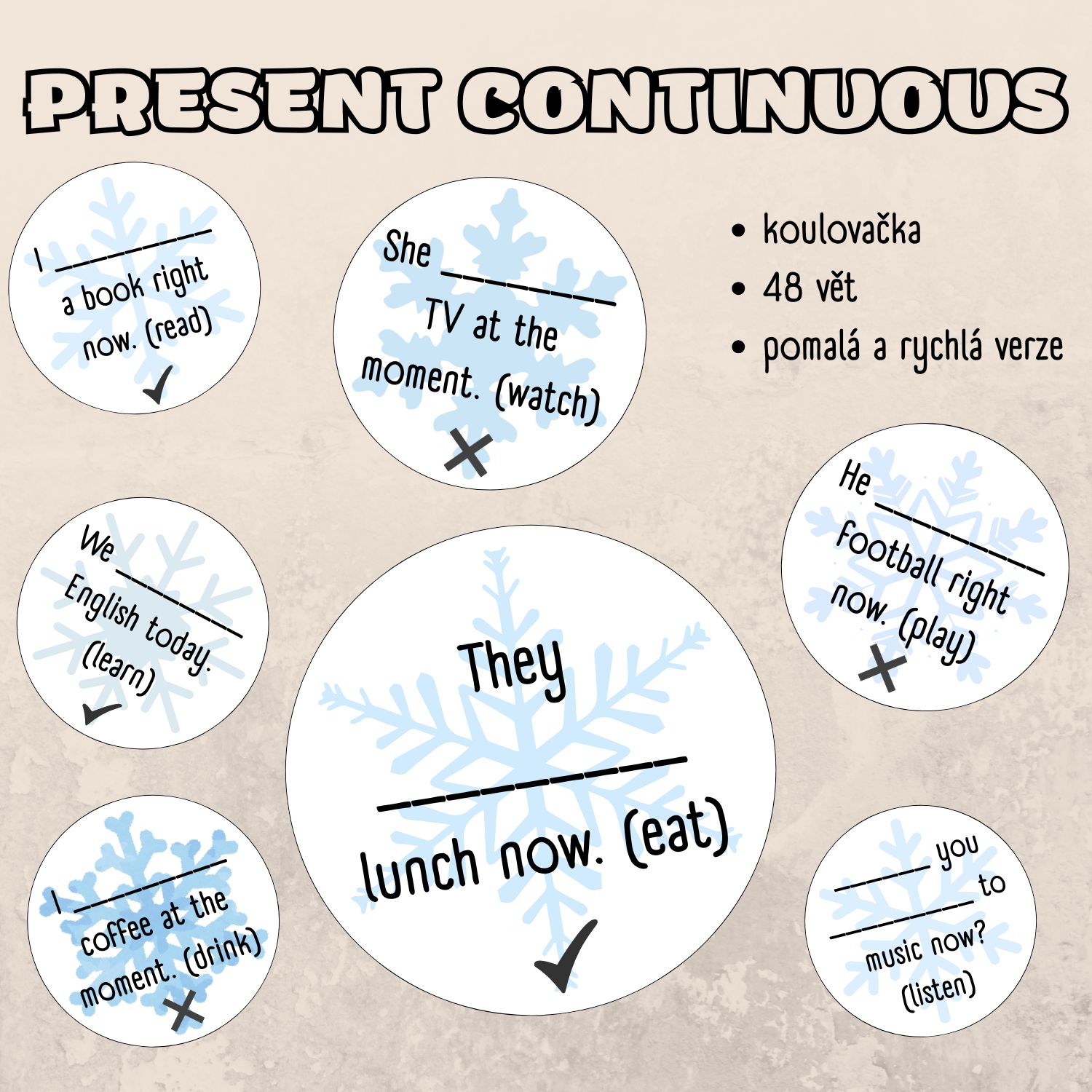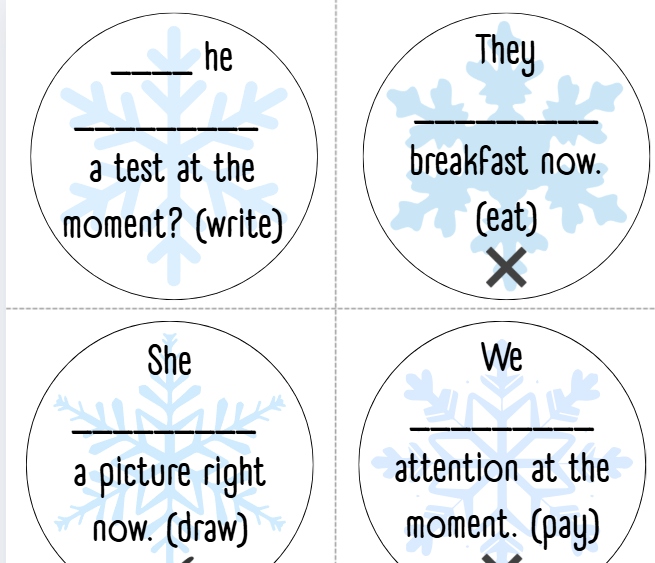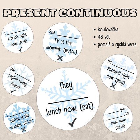 Oblíbená koulovačka na procvičení gramatiky - přítomný čas průběhový - kladné věty, záporné věty, otázky.