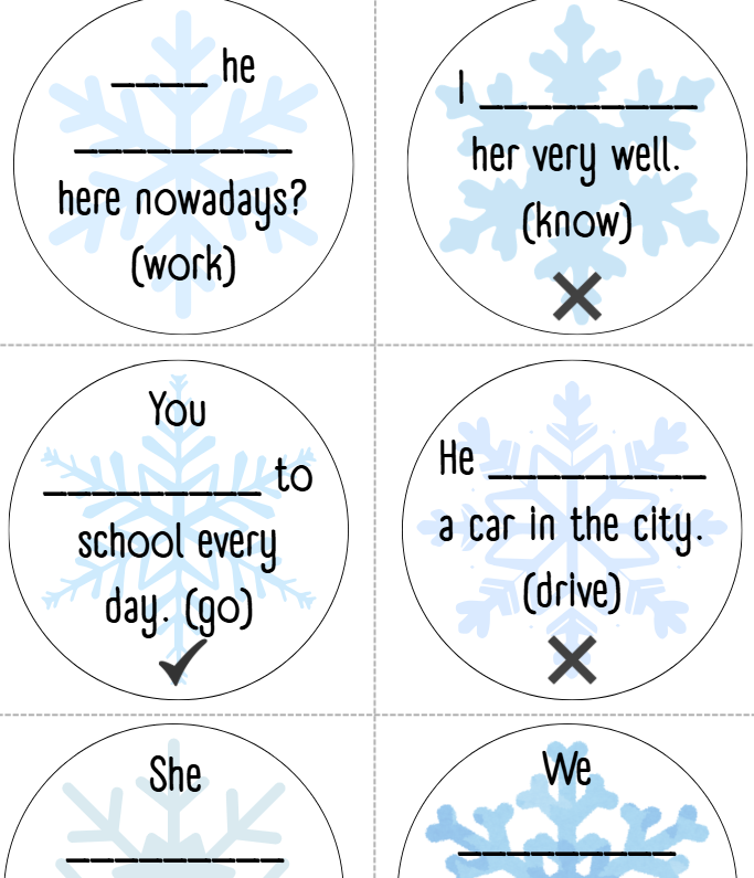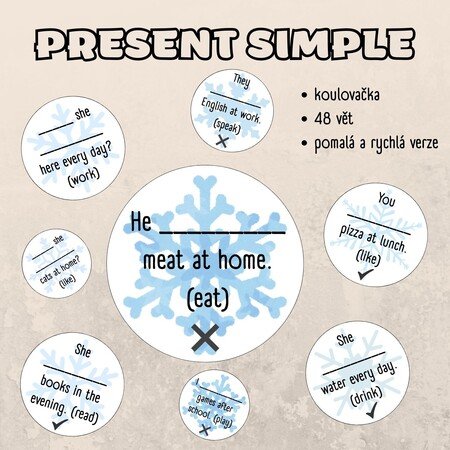 Oblíbená koulovačka na procvičení gramatiky - present simple - kladná věta, záporná věta, otázka.