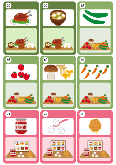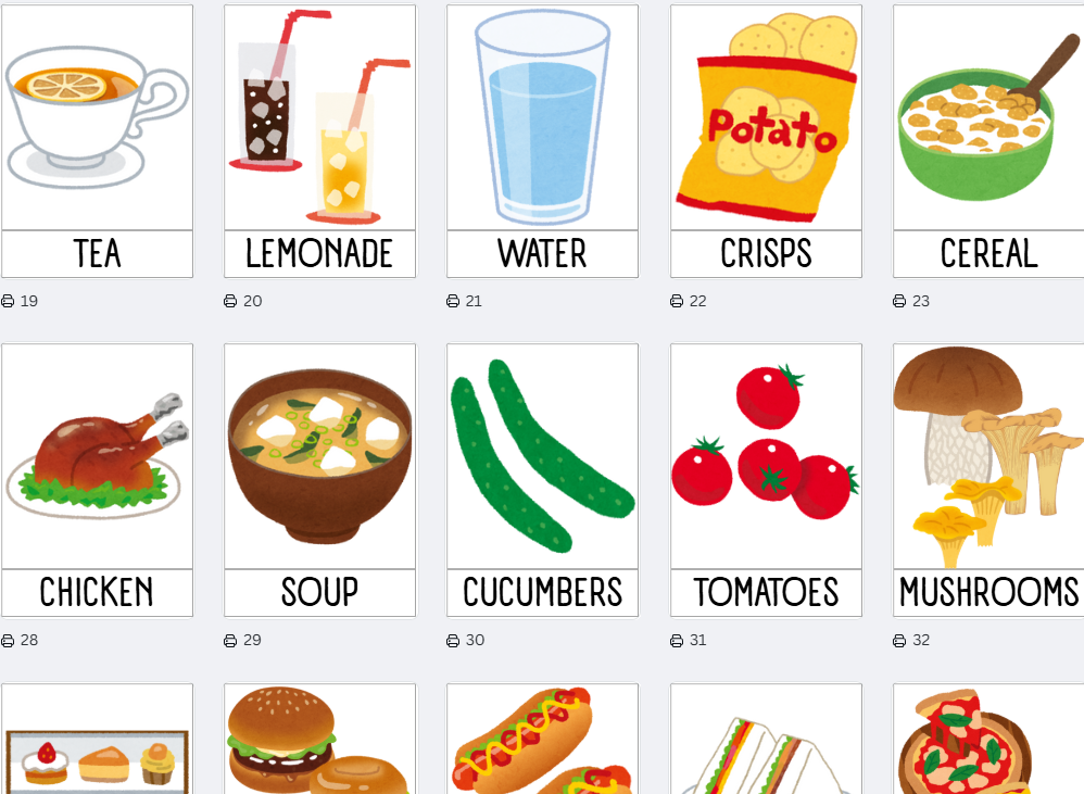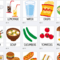 (RICE, BREAD, POTATOES, PASTA, BANANAS, ORANGES, GRAPES, PEARS, MILK, TEA, LEMONADE, WATER, CRISPS, CEREAL, BISCUITS, CHOCOLATE, CHEESE, MEAT, CHICKEN, SOUP, CUCUMBERS, TOMATOES, MUSHROOMS, CARROTS, JAM, SUGAR, HONEY, CAKES, BURGERS, HOT DOGS, SANDWICHES, PIZZAS)