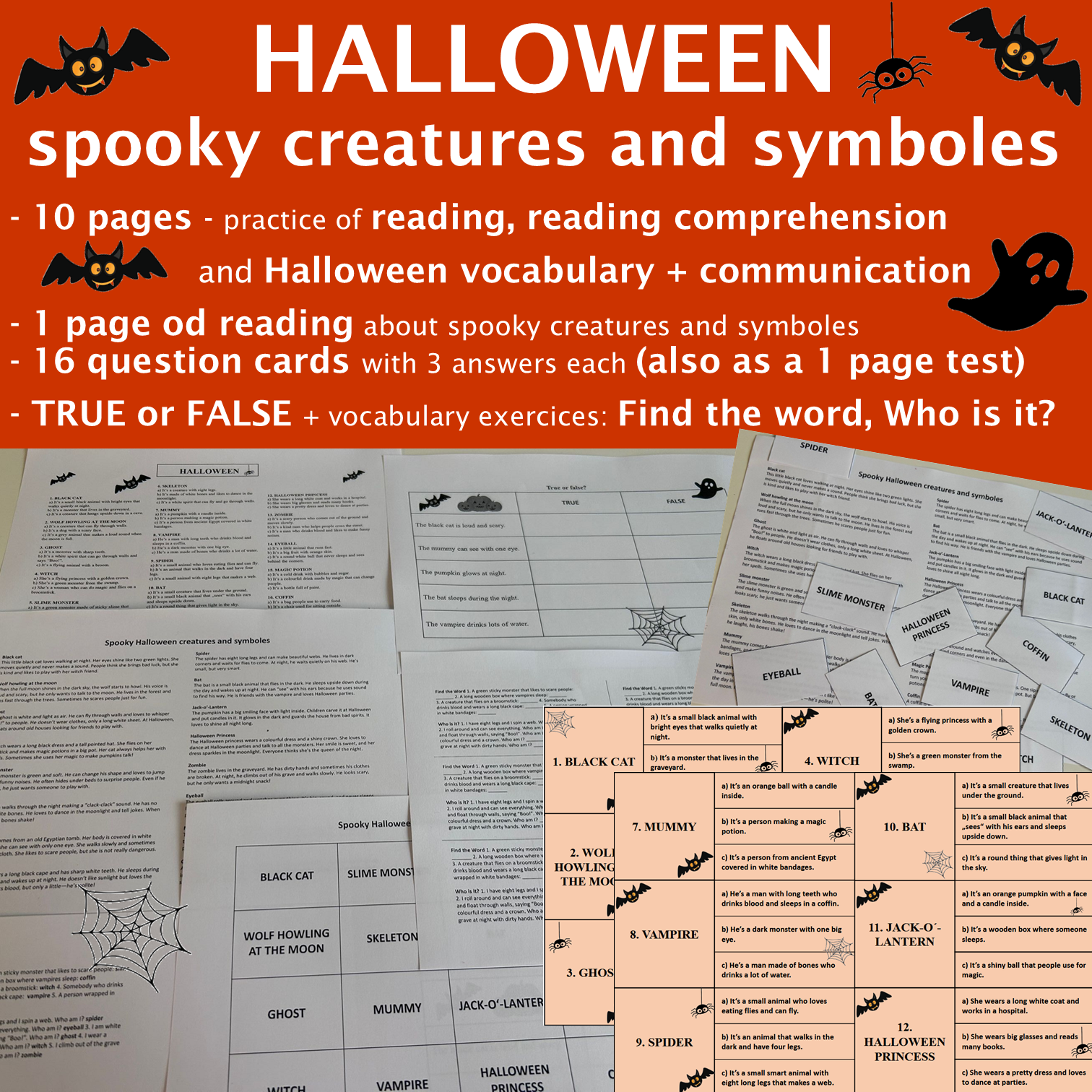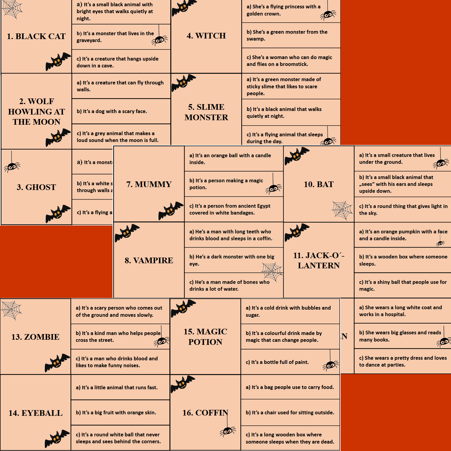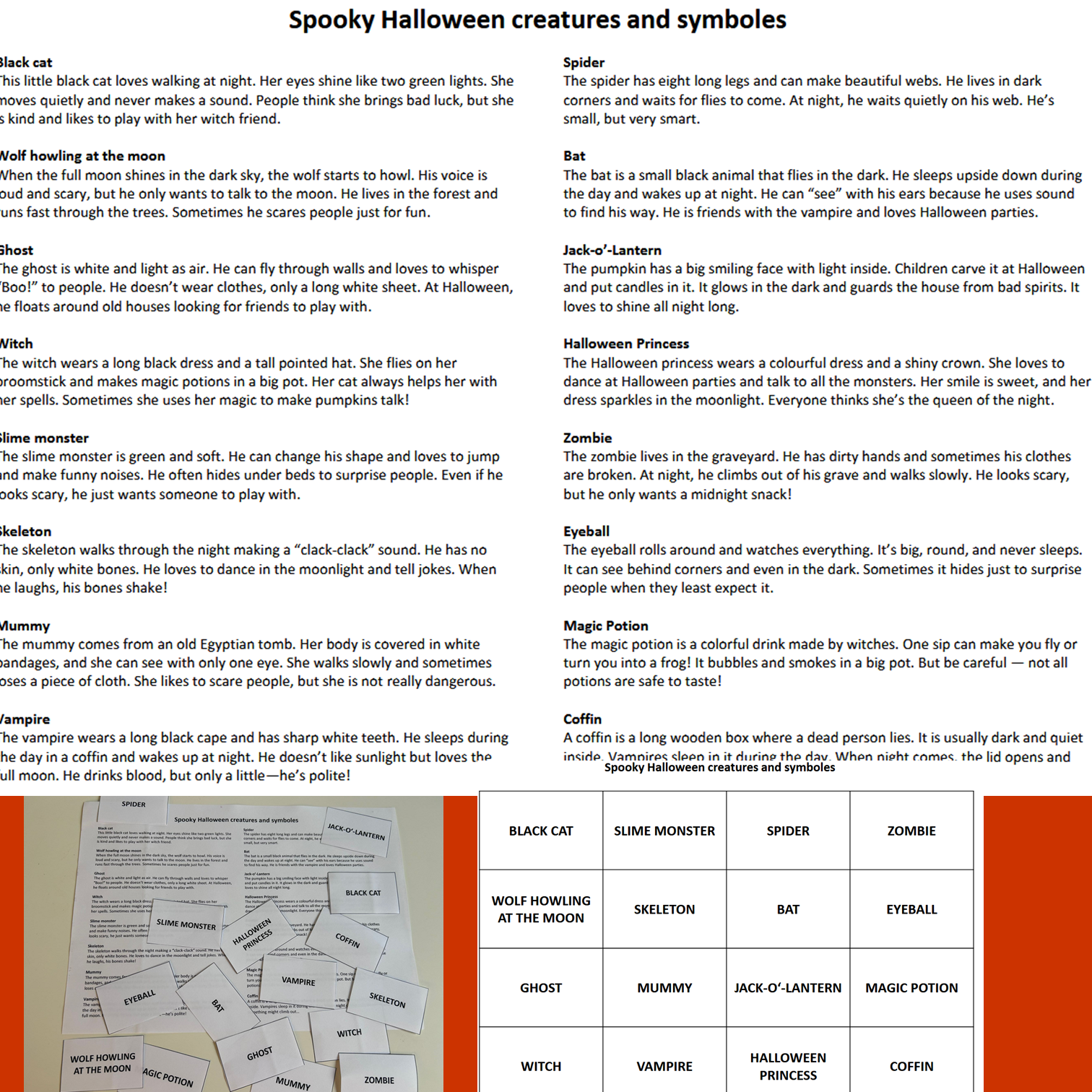 Touto aktivitou zpestříte dětem hodinu, uvedete je do tématu Halloween a procvičíte s nimi čtení a paměť či orientaci v textu, také komunikaci (popis postavy/symbolu a hádání kdo je kdo/co). Zároveň si procvičí anglická slovíčka k tématu.