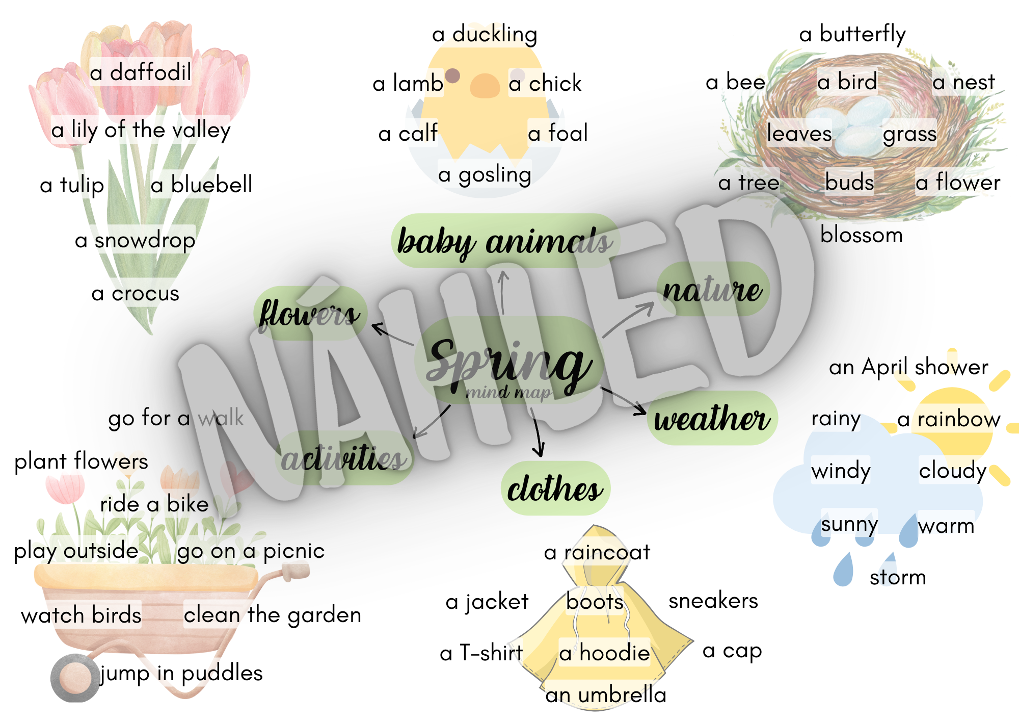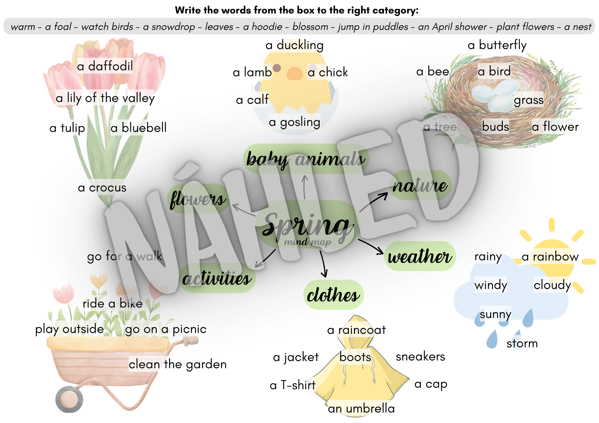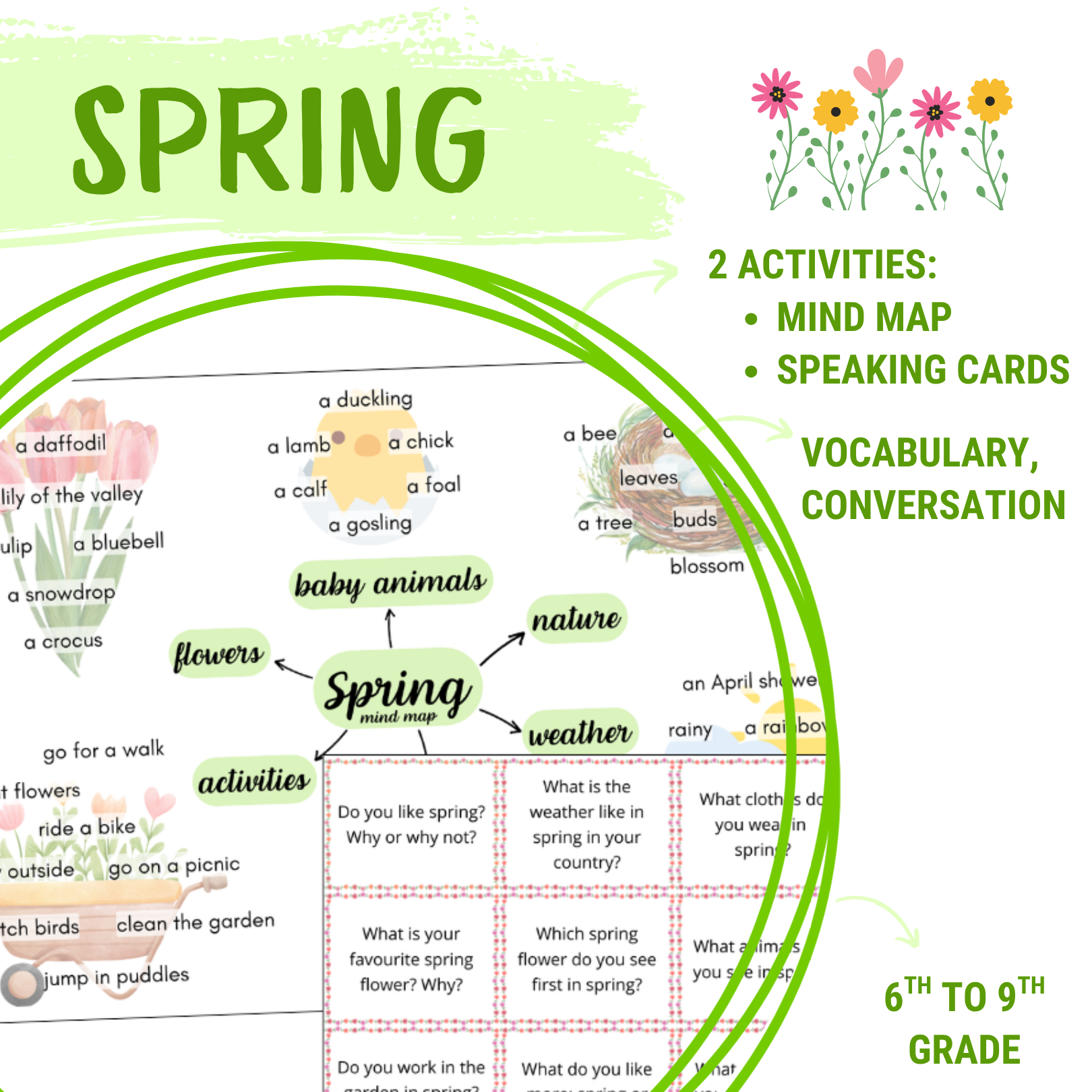 Aktivity zaměřené na procvičení slovní zásoby a mluvení na téma jaro. Materiál obsahuje myšlenkovou mapu a konverzační karty.