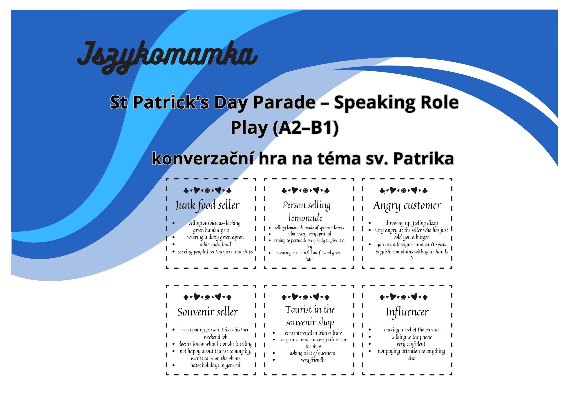 Interaktivní aktivita formou role-play ke Dni svatého Patrika, vhodná pro úroveň A2–B1 (2. stupeň ZŠ, SŠ).