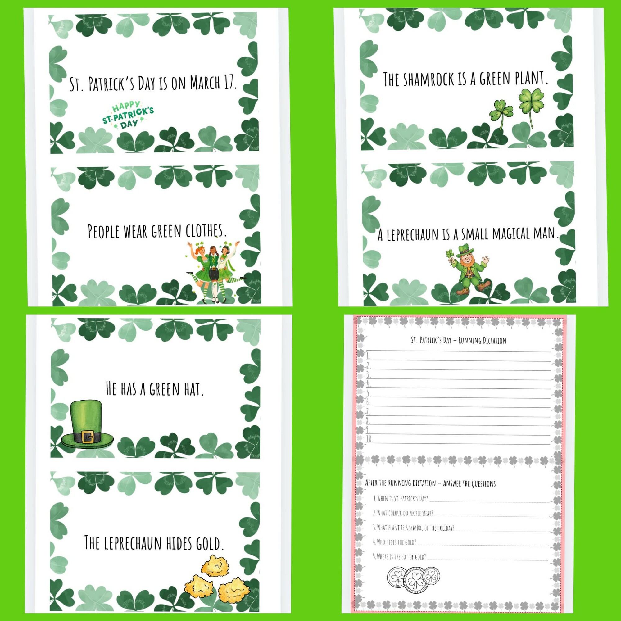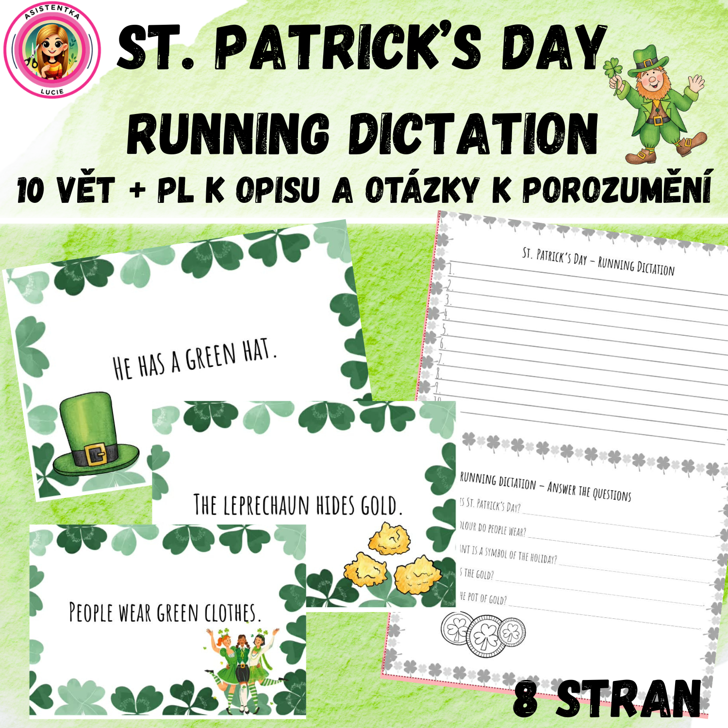 Tento materiál je určen pro žáky 1. stupně základní školy a slouží k hravému procvičení anglického jazyka prostřednictvím aktivity běhací diktát (running dictation) na téma St. Patrick’s Day – Den svatého Patrika. Aktivita podporuje aktivní zapojení žáků, rozvíjí jejich schopnost porozumět jednoduchému anglickému textu a zároveň procvičuje paměť, spolupráci a pohyb.
