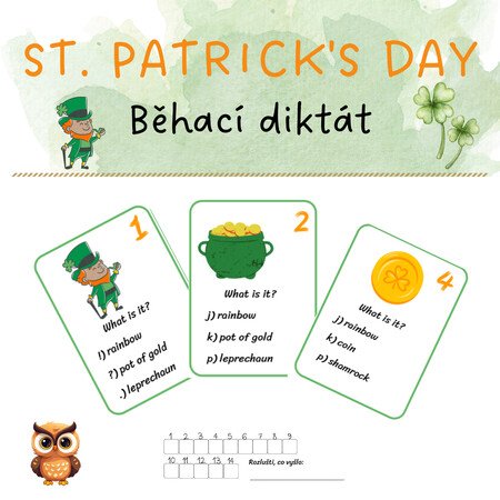 Oslavte svátek svatého Patrika pohybem! Tento běhací diktát procvičí postřeh, paměť i pravopis. Rozmístěte karty po třídě či venku a nechte děti ulovit všechny informace o irských tradicích. Zábava a zelená barva zaručena pro celou třídu!