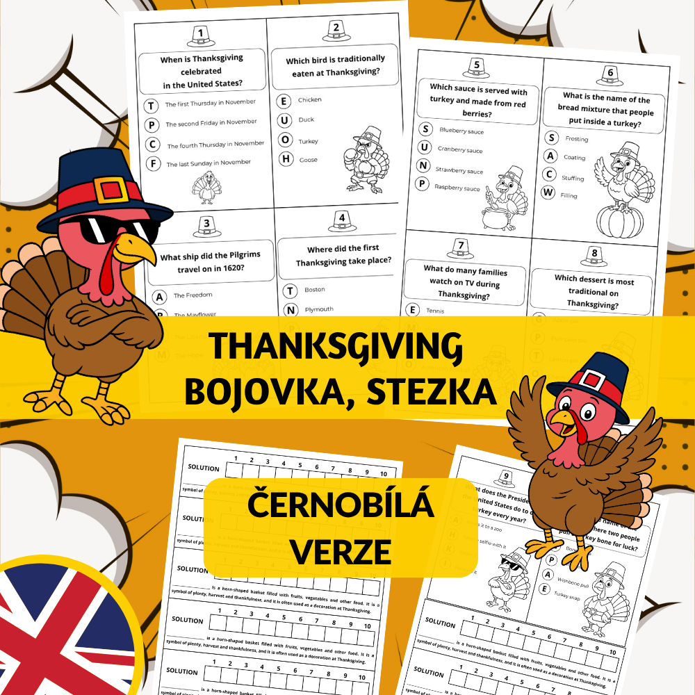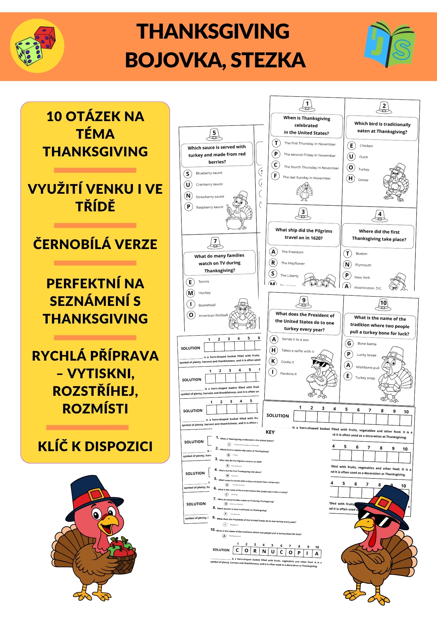 Tato zábavná Thanksgiving stezka obsahuje 10 karet s kvízovými otázkami, díky kterým si žáci procvičí slovní zásobu, reálie a porozumění textu. U každé správné odpovědi získají písmeno do tajenky, kterou nakonec vyluští. Součástí je řešení. Materiál lze využít uvnitř třídy, venku, ve skupinách, na stanovištích nebo jako „běhací aktivitu“.