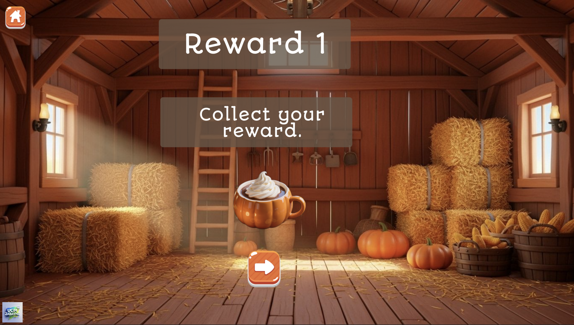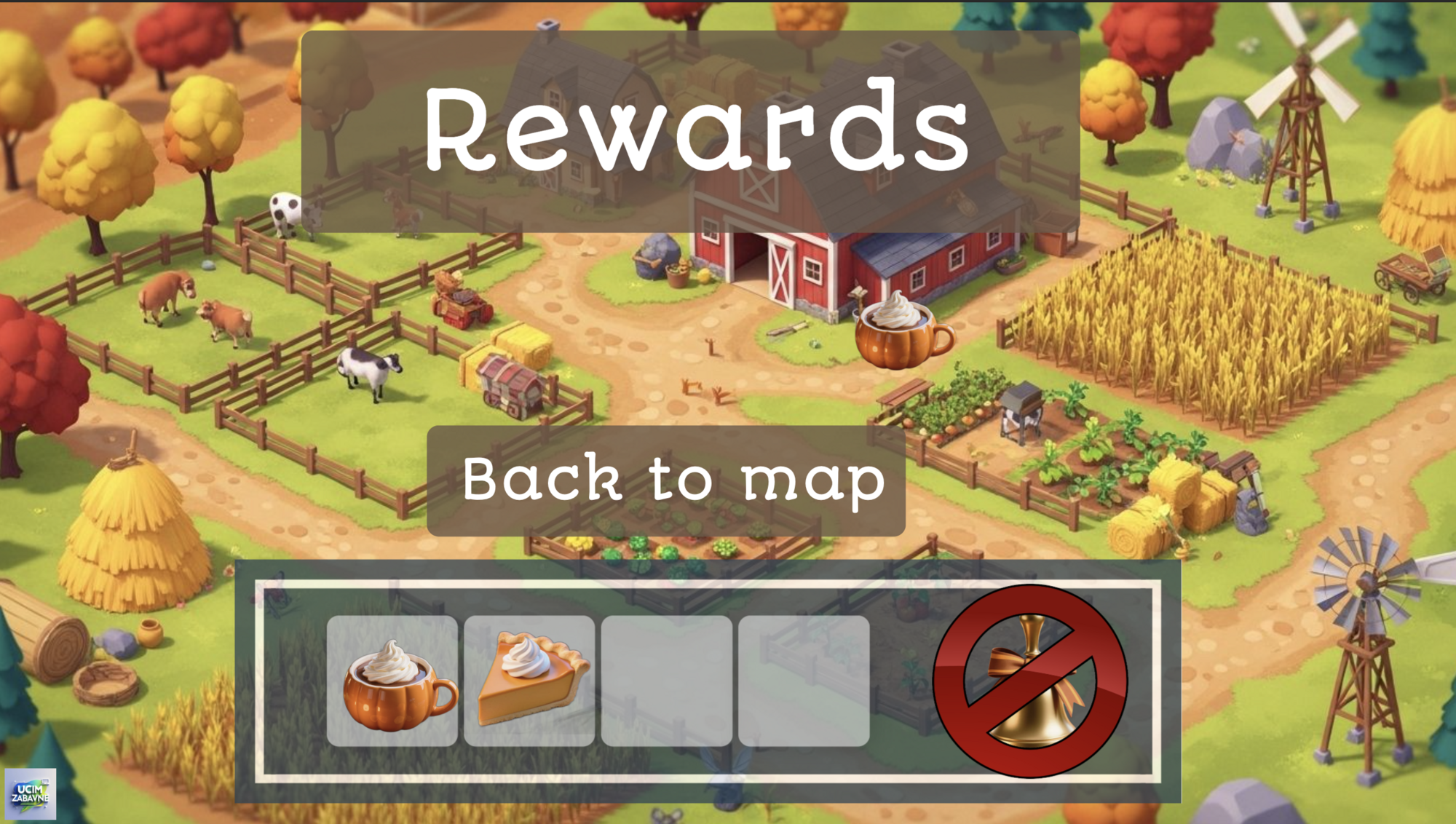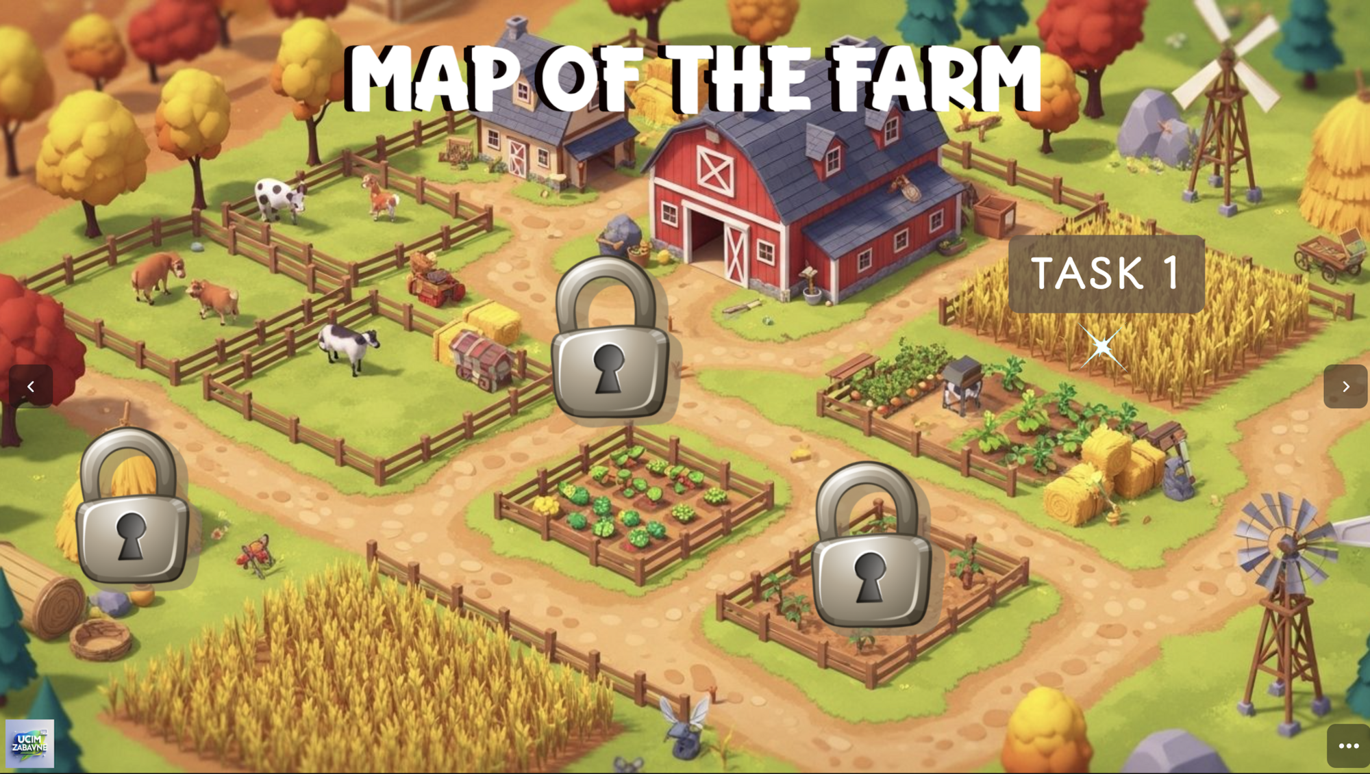 Po celou dobu sbírá žák odměny, po splnění všech 4 hlavních úkolů klikne na hlavní odměnu (zvon) a následuje závěrečná obrazovka (opět obsahuje audio)