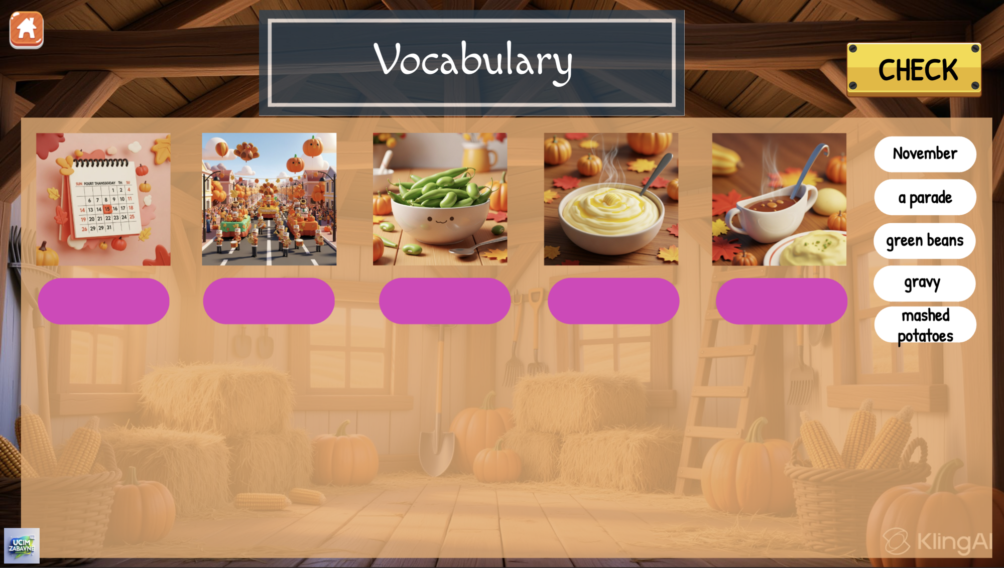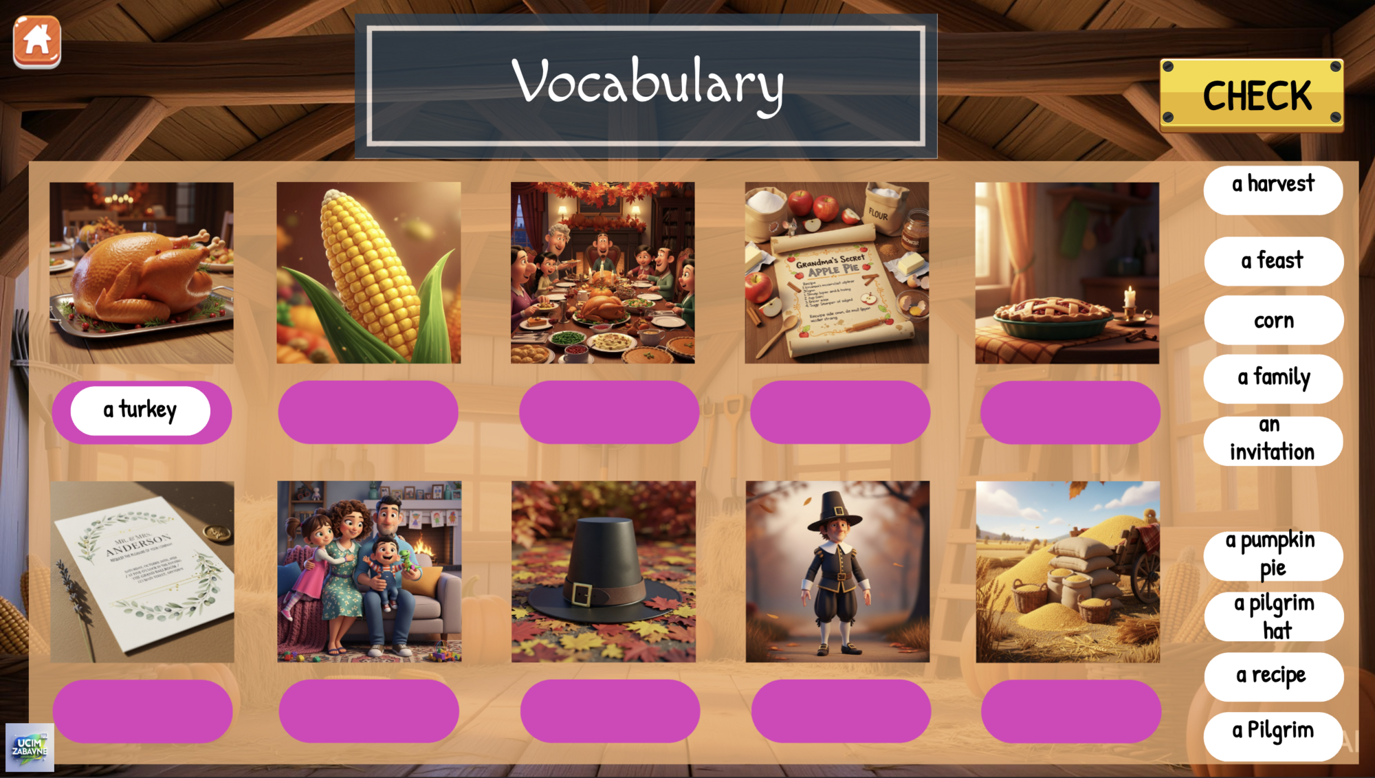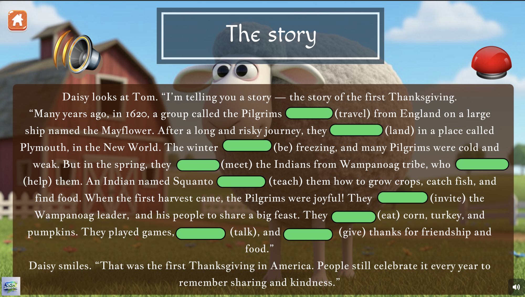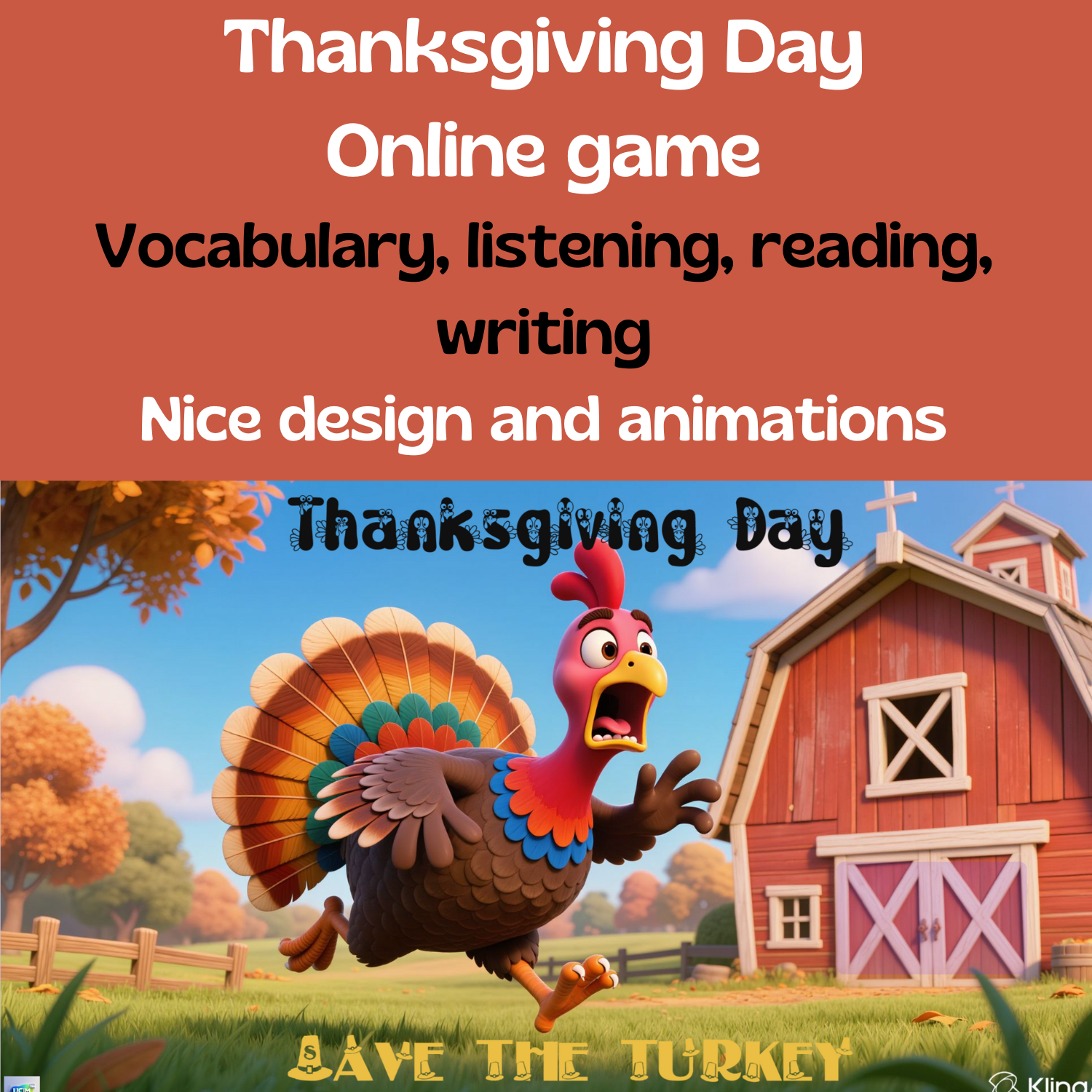 Představuji online hru zaměřenou na svátek Dne díkuvzdání v moderním Pixar 3D animovaném stylu. Doporučuji podívat se na zrychlenou video ukázku celé hry. Obsahuje 4 hlavní části, ve kterých si žáci procvičí slovíčka, poslech, čtení a logické uvažování. Ve hře vystupuje jako hlavní postava krocan Tom. Ten je vyděšený, protože slyšel o tradici jezení krocanů a chce zjistit, jaký je původ tohoto svátku. Hra obsahuje několik krátkých několika vteřinových videí a také audio prvků včetně poslechu, doporučuji mít sluchátka.
