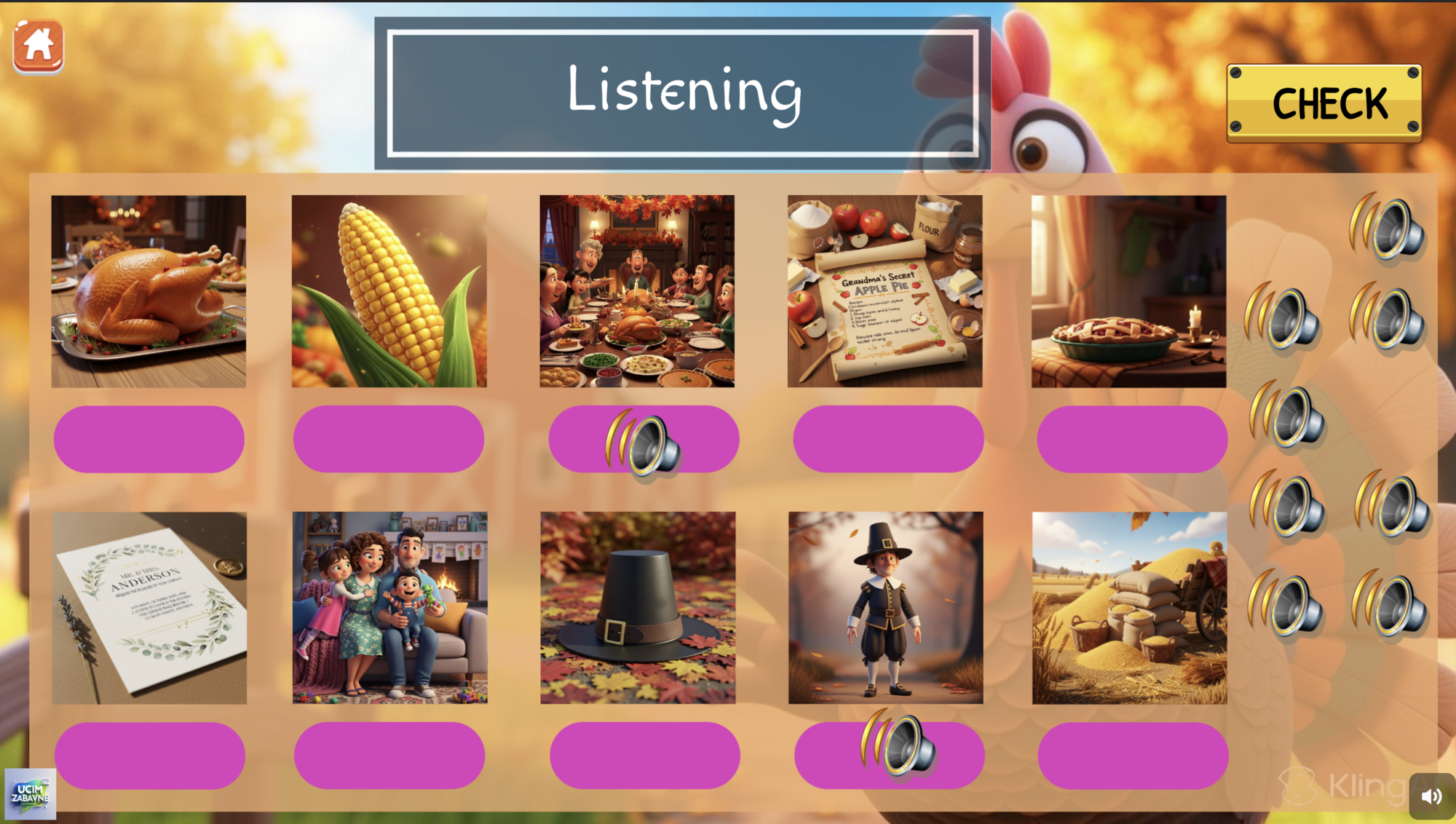 V tomto cvičení je stejných 15 slovíček. Rozdíl je v tom, že žák klikne na reproduktor a uslyší krátký popis jednotlivých slov. Musí je podle popisu správně přiřadit. Kontrola probíhá stejně.