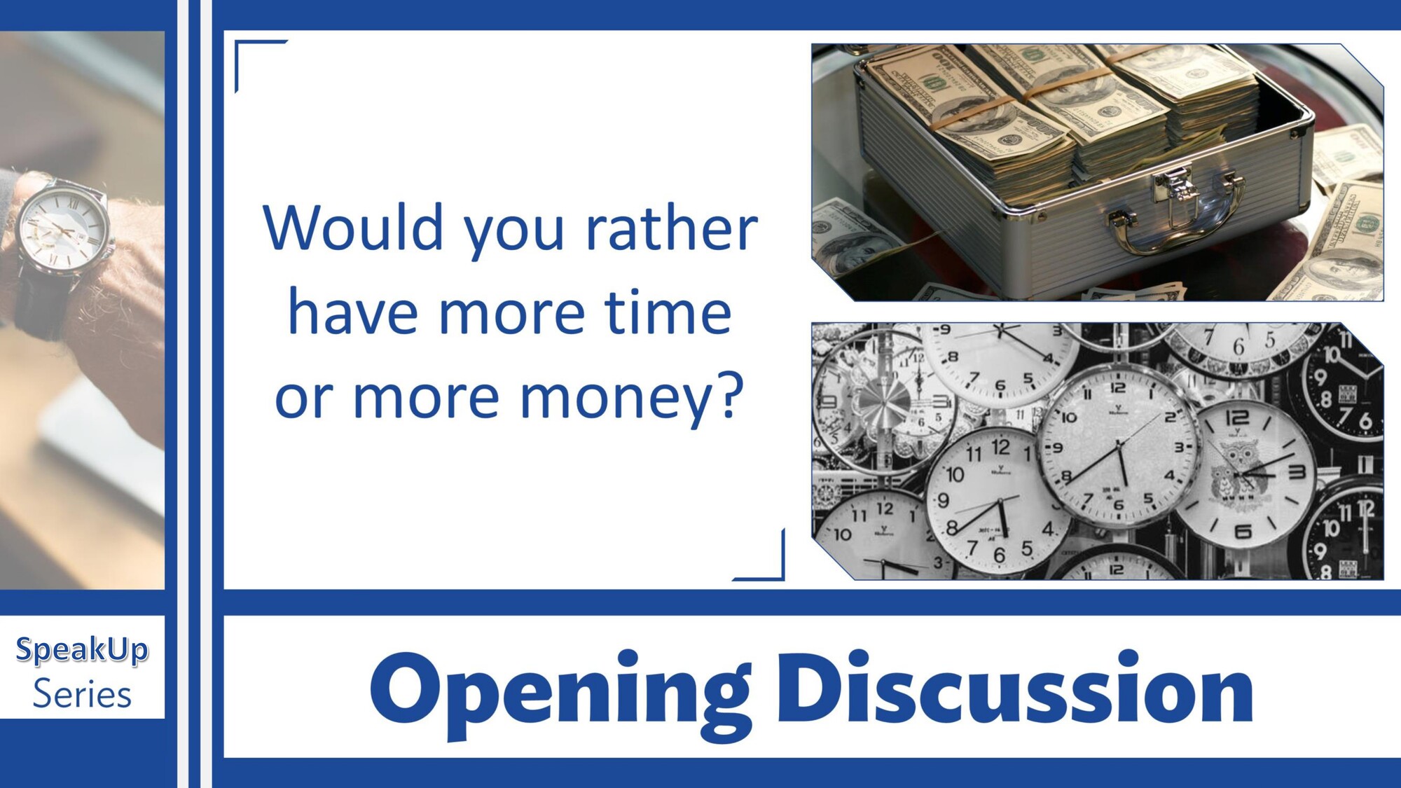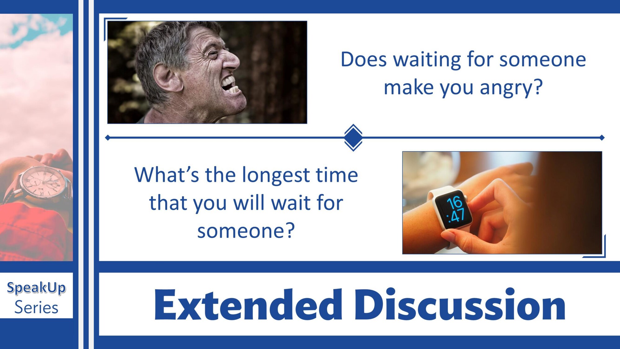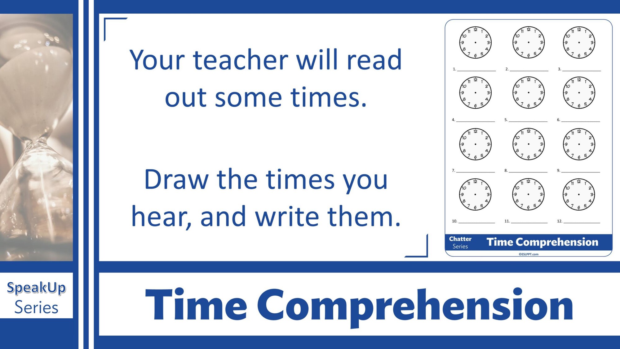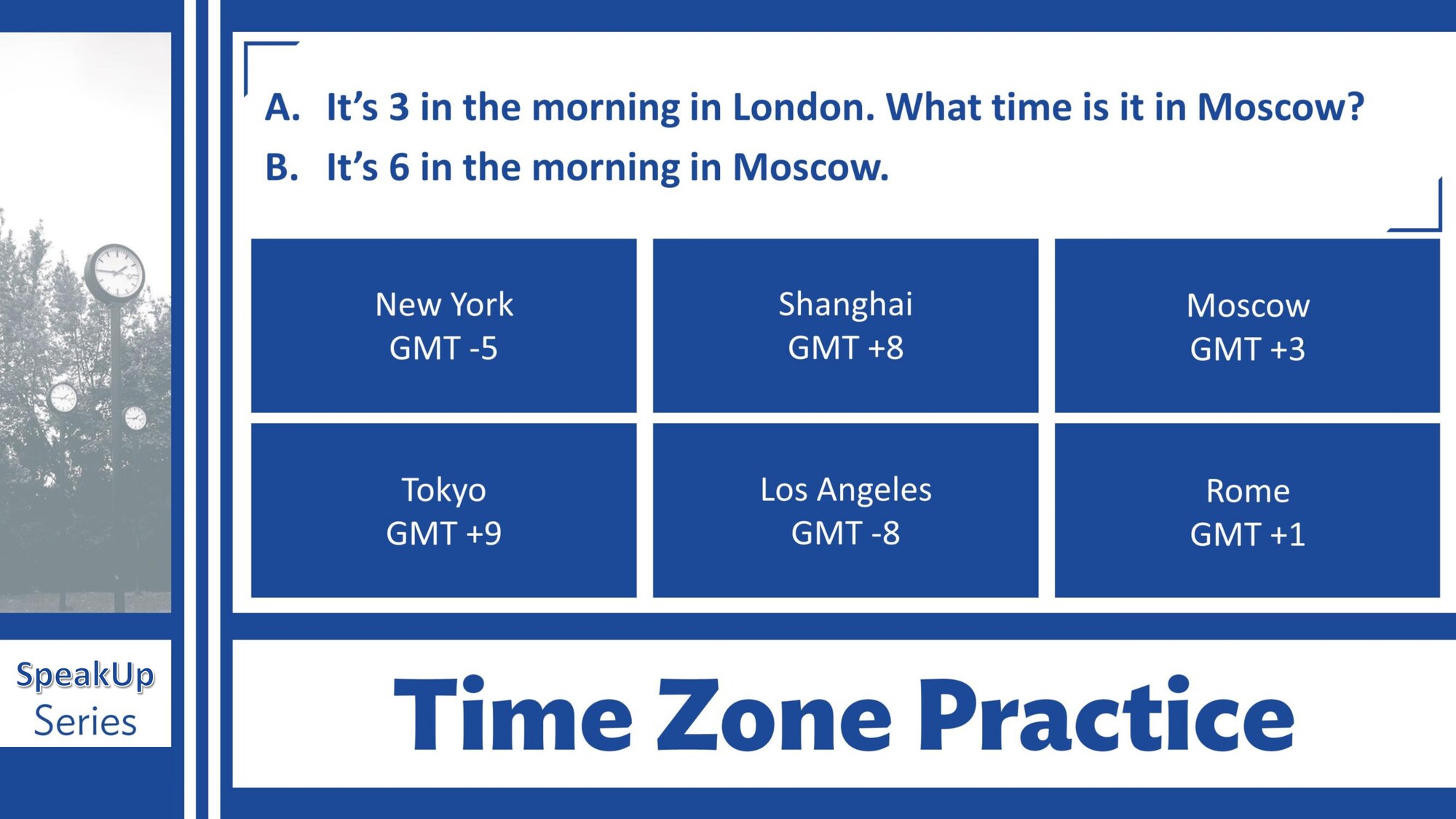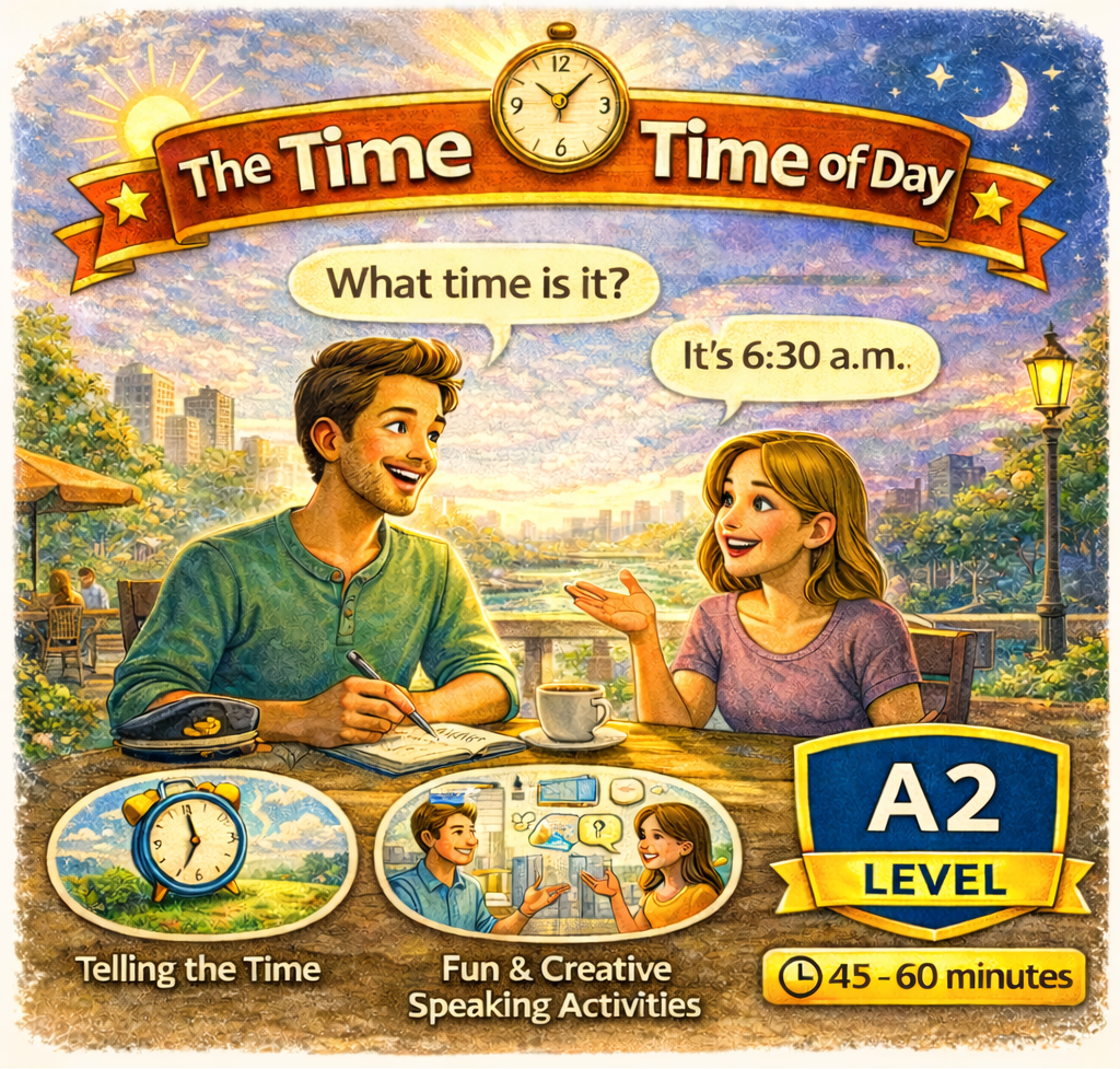 Materiál SpeakUp 07 – The Time and Time of Day se zaměřuje na určování času, části dne a jejich používání v běžné konverzaci. Studenti procvičují otázky na čas a mluví o každodenní rutině.