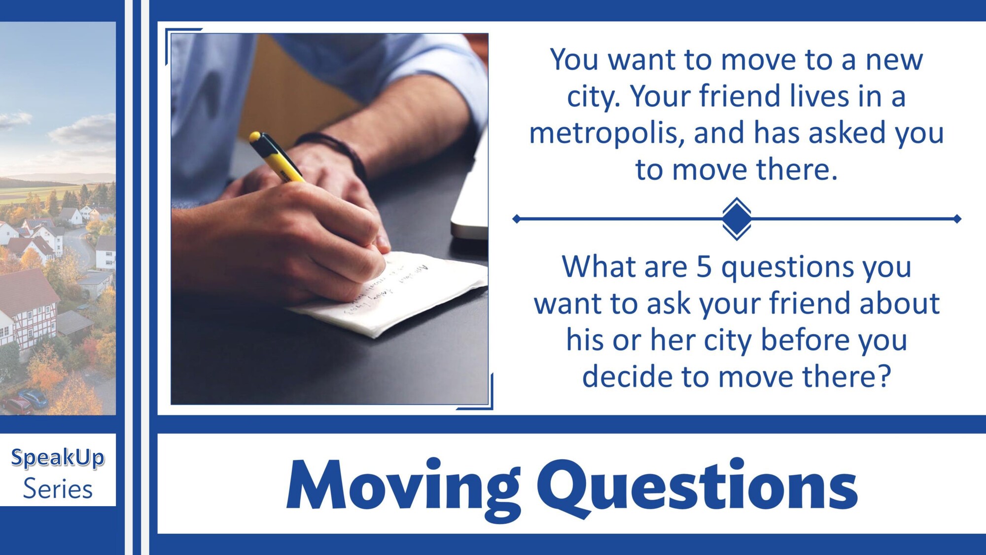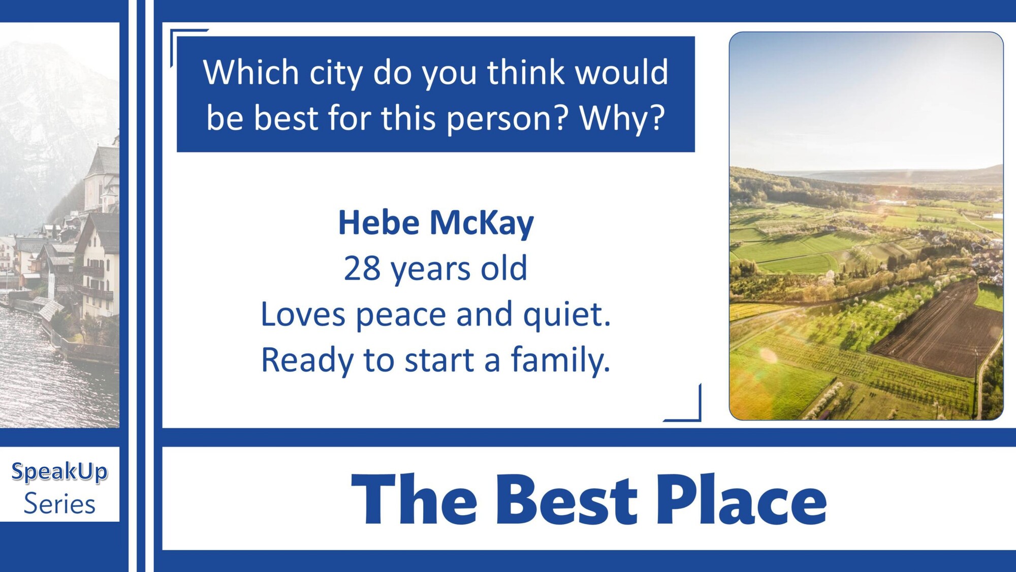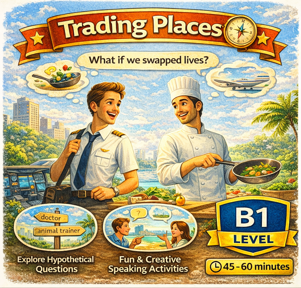Materiál SpeakUp 08 – Trading Places rozvíjí schopnost představit si život z jiné perspektivy. Studenti diskutují o tom, jaké by to bylo vyměnit si role, profese nebo životní situace a procvičují podmínkové a hypotetické věty.