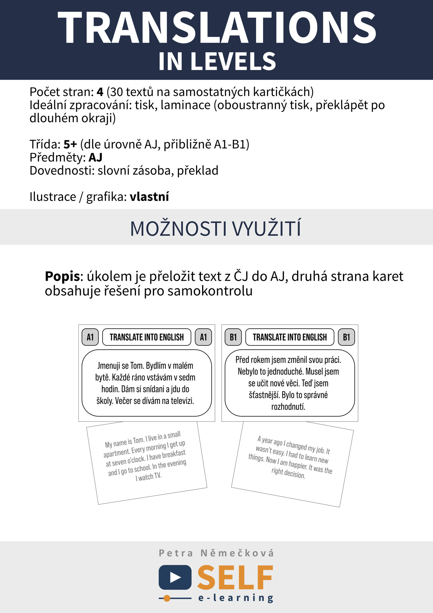 Popis: úkolem je přeložit text z ČJ do AJ, druhá strana karet obsahuje řešení pro samokontrolu