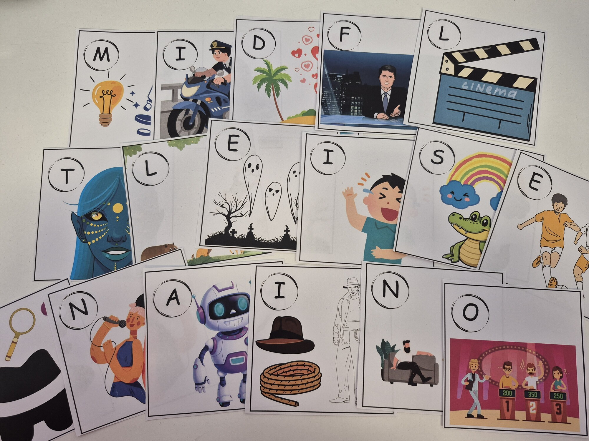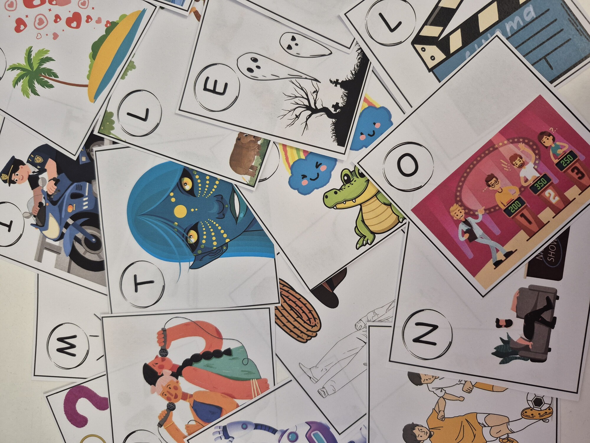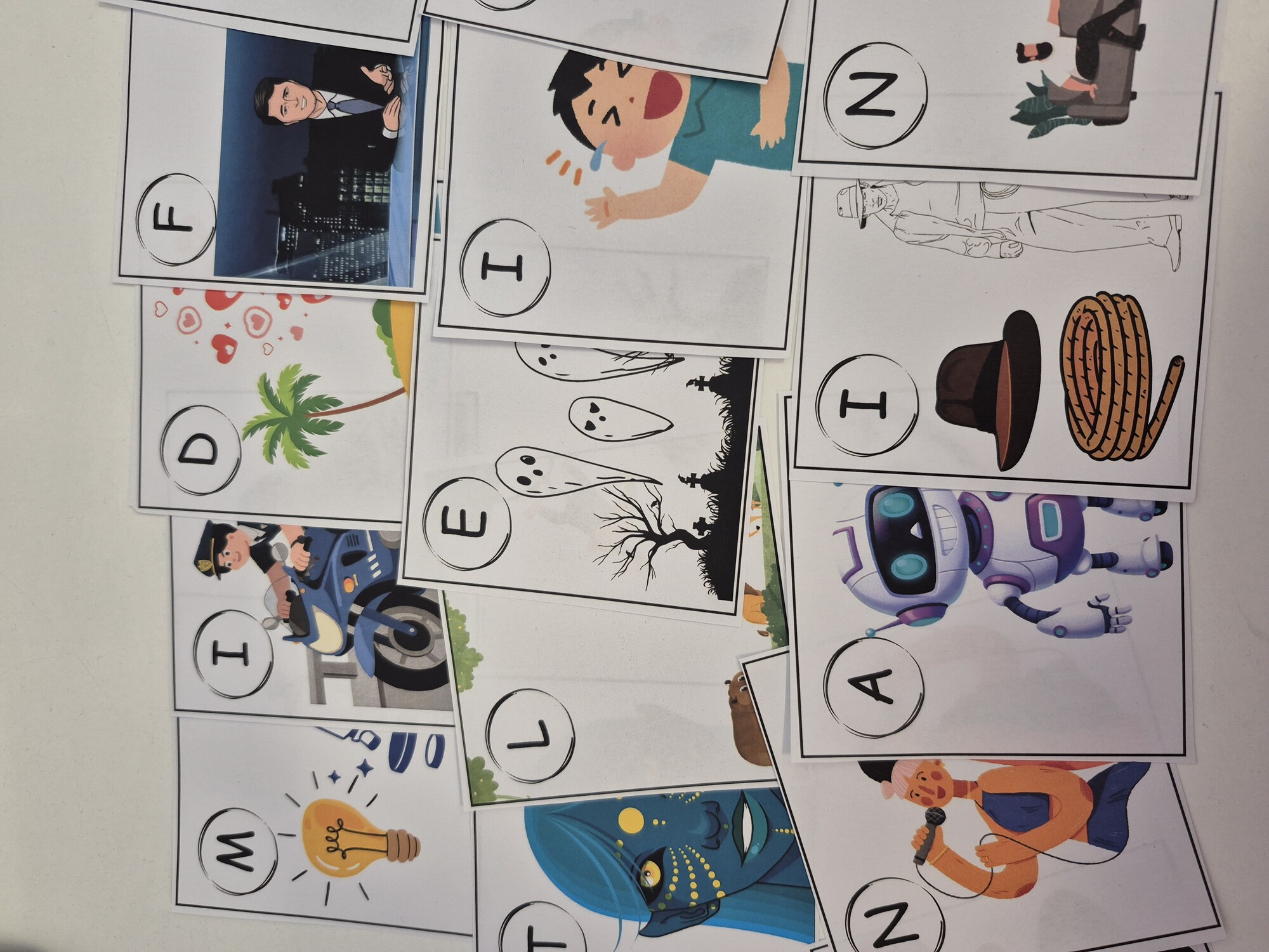 Následně vyhledají kartičku, na které se dané slovíčko nachází, a zapamatují si písmeno uvedené u obrázku.