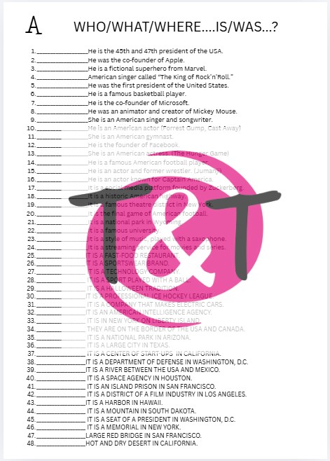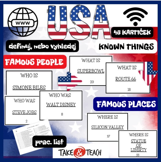 Nechte žáky charakterizovat 48 nejznámějších lidí, míst a věcí z USA. Žáci buď pomocí svých vědomostí nebo mohou vyhledat na internetu definují, popíší známé osobnosti, místa a věci.